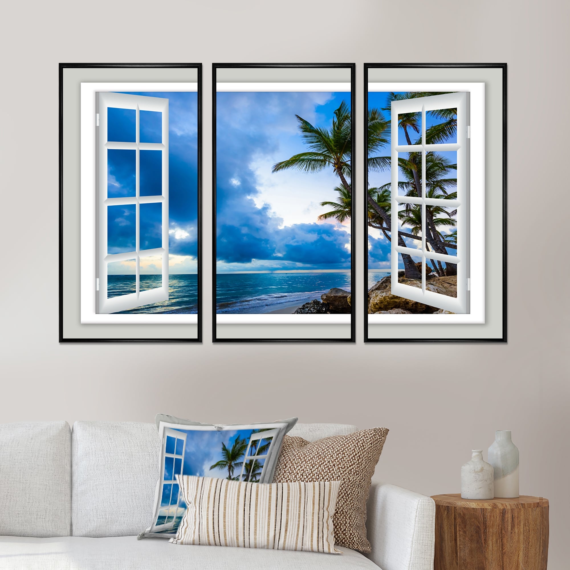 Designart "Window Open to Beach with Palm" Sea & Shore Framed Art Set of 3 - 4 Colors of Frames