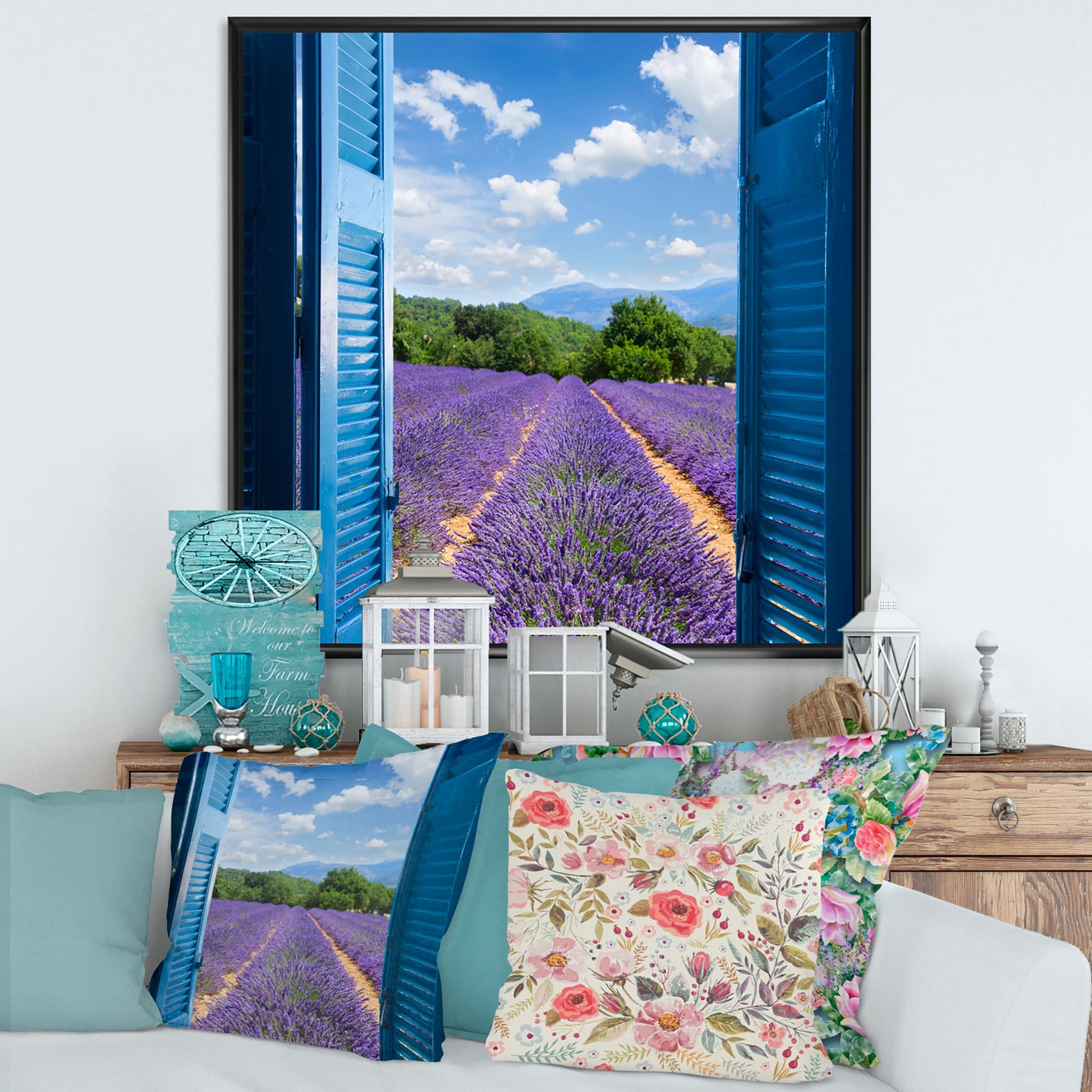 Designart "Lavender Field Through Blue Open Cottage Window" Farmhouse Framed Canvas Wall Art Print