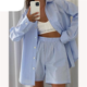 Women Casual Striped Two Piece Set | Lounge Wear Shorts | Women Tracksuit | High Waist Shorts Two Piece Set | Straight Long Sleeve Shirt
