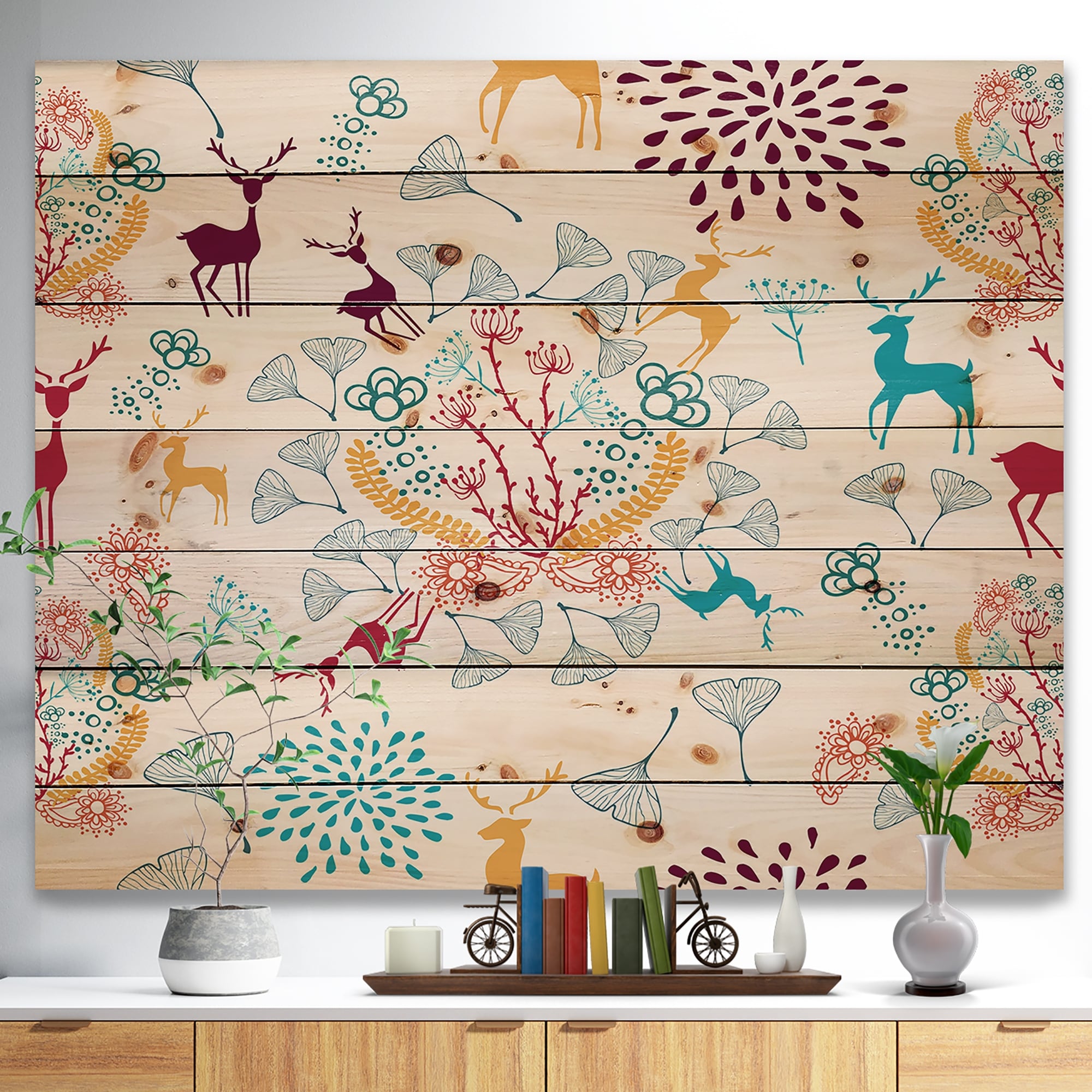 Designart 'Yellow Blue Brown Reindeer christmas pattern' Print on Natural Pine Wood