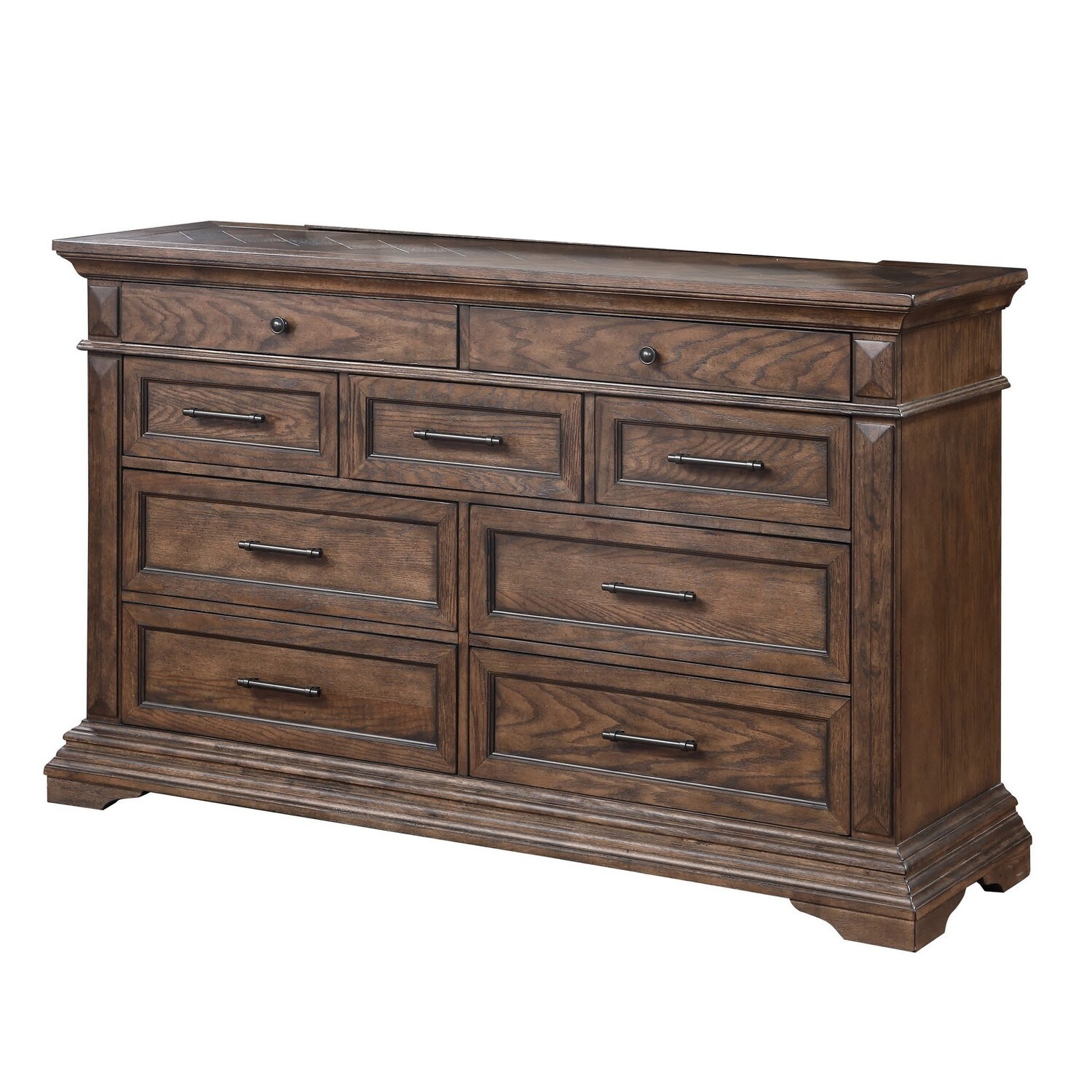 9 Drawer Wooden Dresser with Metal Handles and Molded Details, Brown