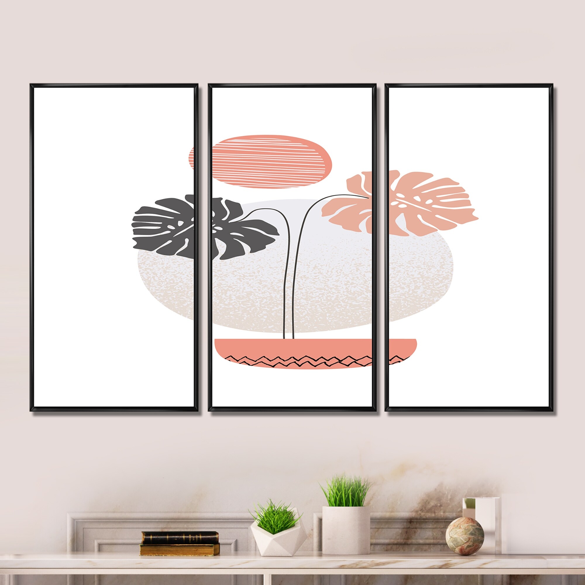 Designart "Abstract One Line Art Tropical Plants I" Tropical Framed Wall Decor Set of 3 - 4 Colors of Frames