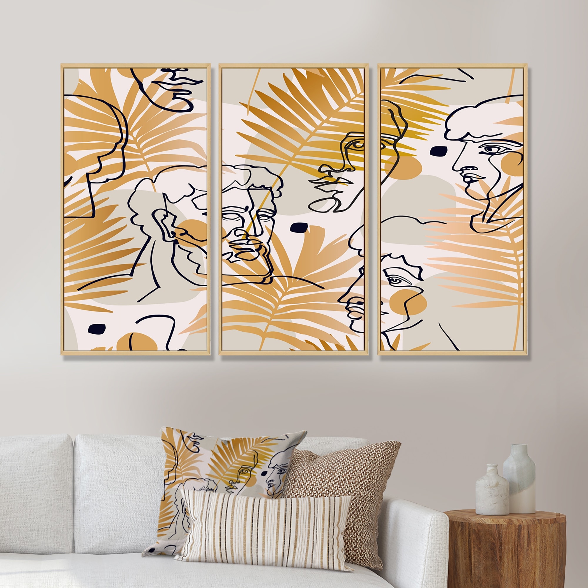 Designart "One Line Art Portrait With Tropical Leaves" Vintage Framed Wall Decor Set of 3 - 4 Colors of Frames