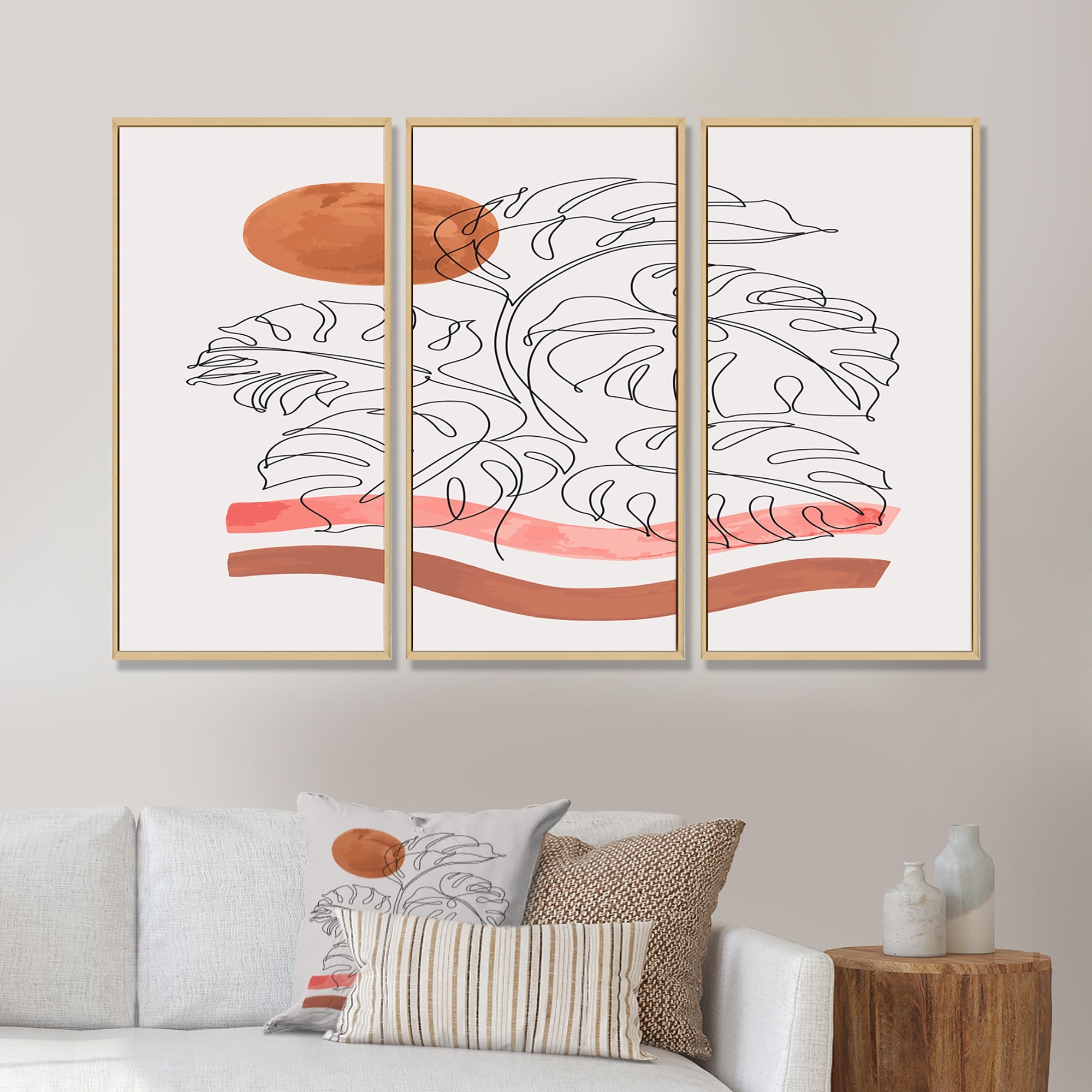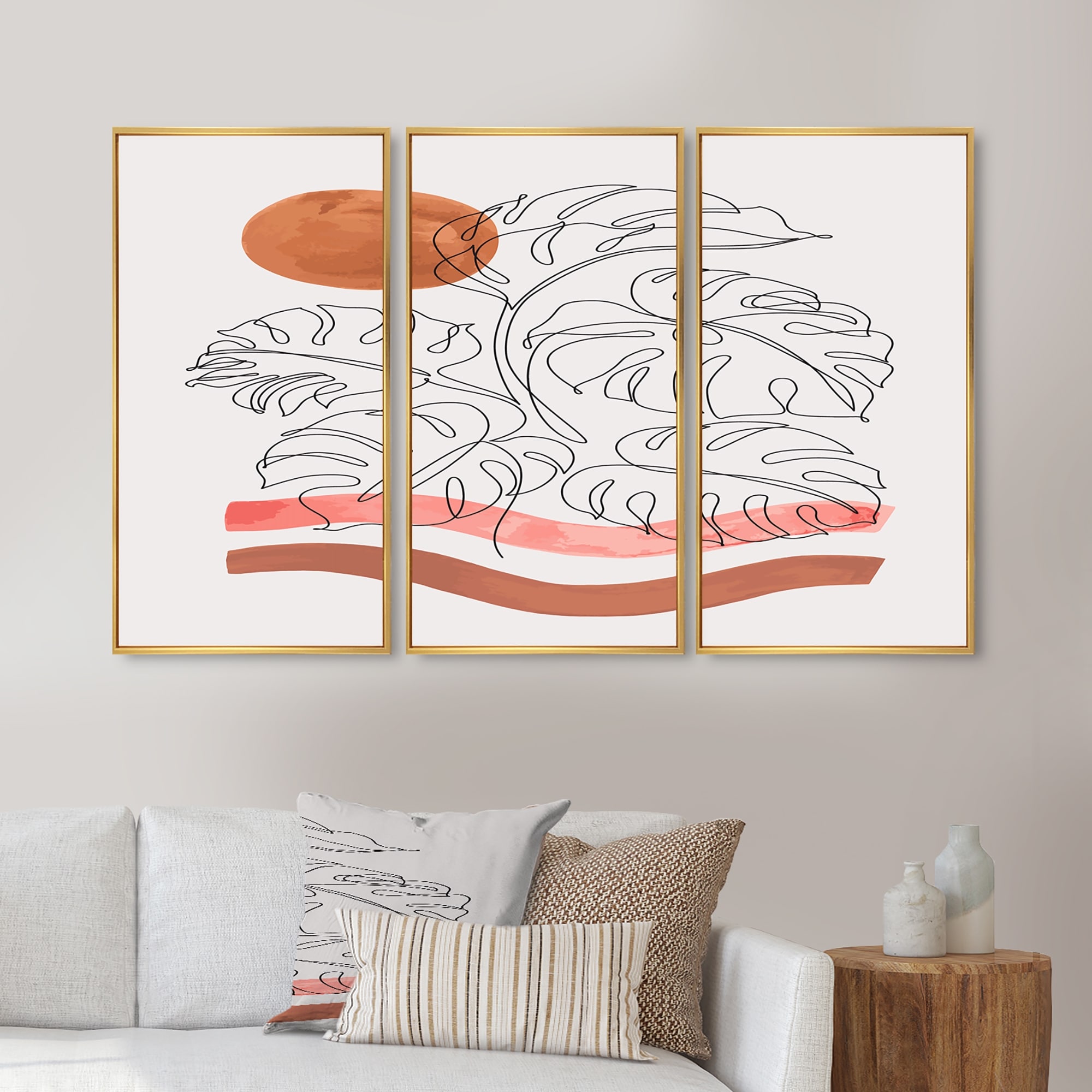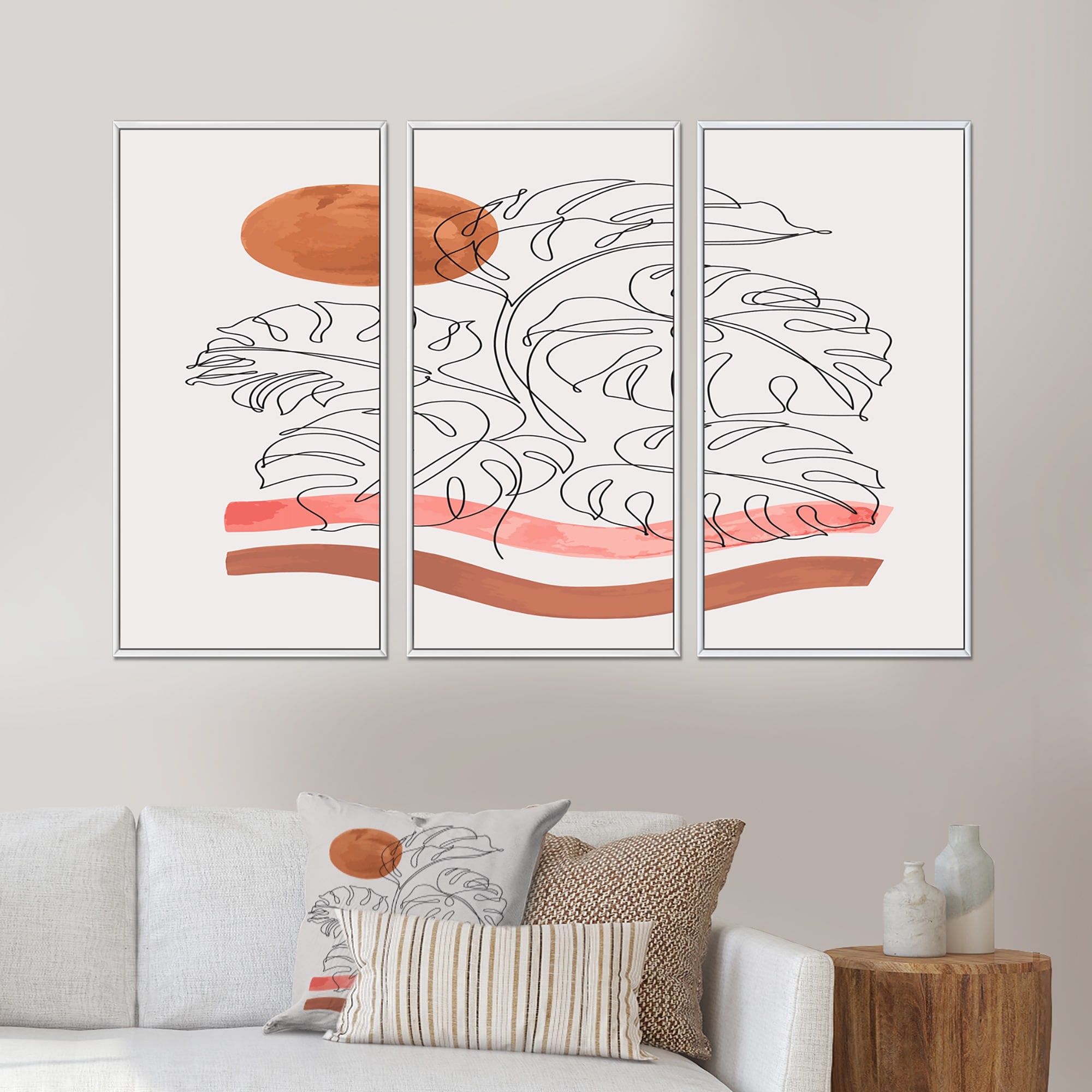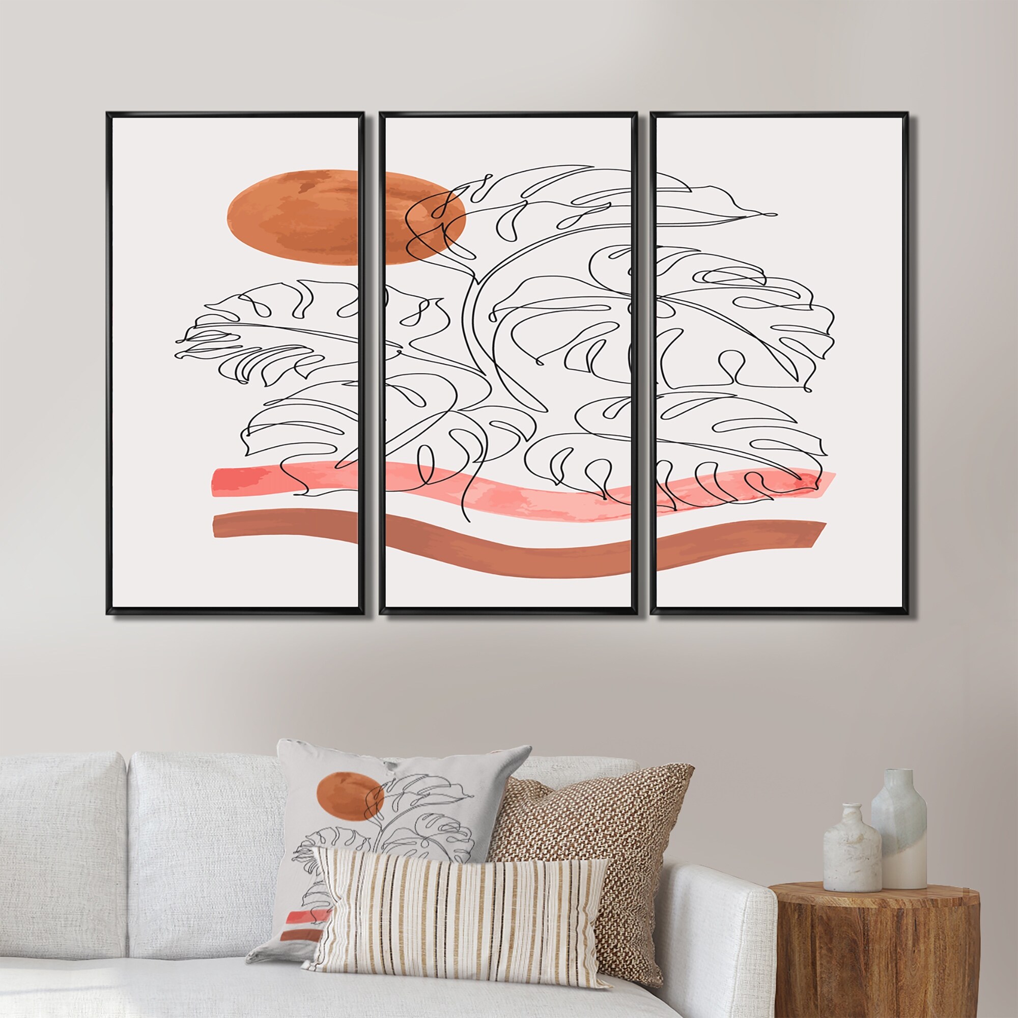 Designart "Tropical Monstera Leaf One Line Art" Modern Framed Canvas Wall Art Print Set of 3 - 4 Colors of Frames