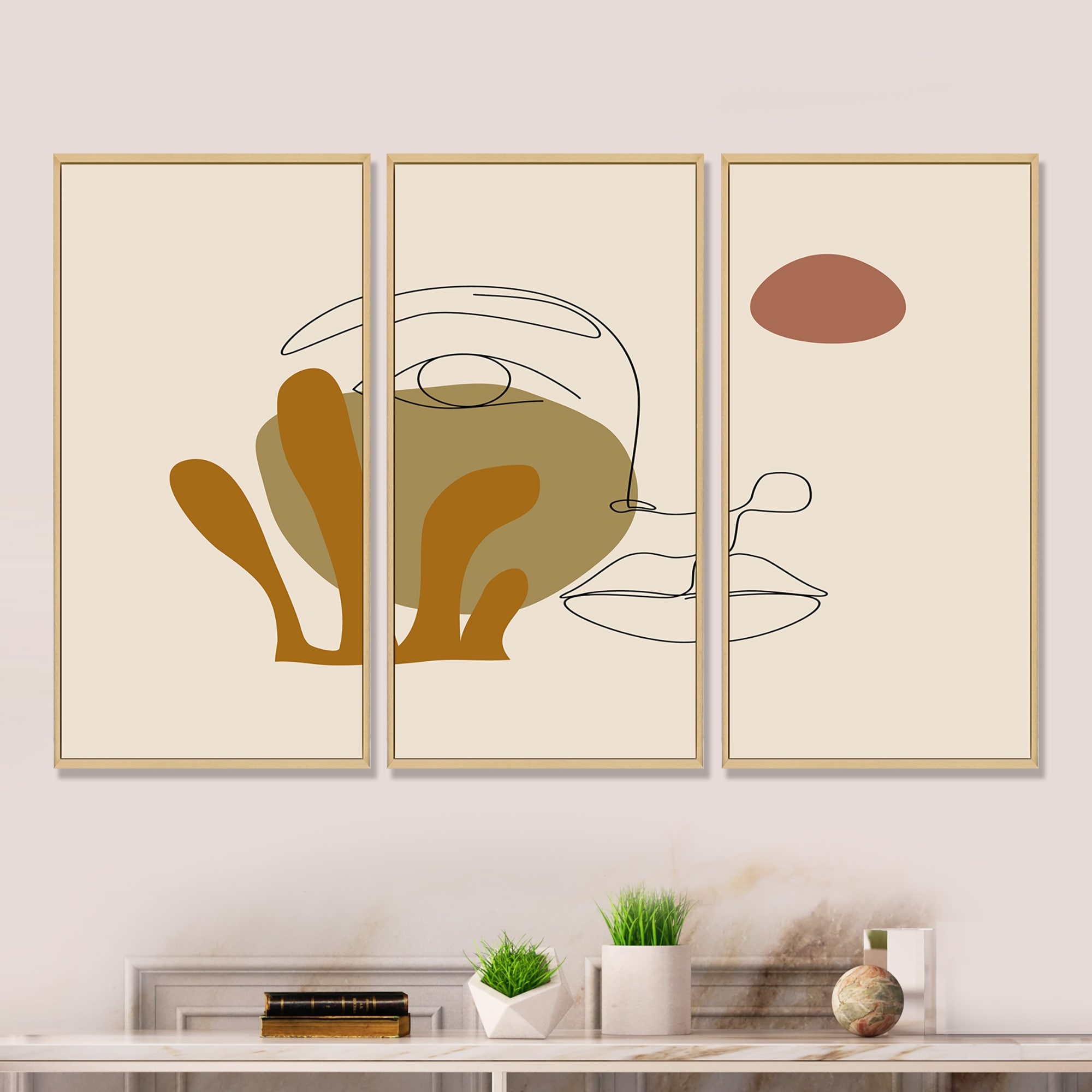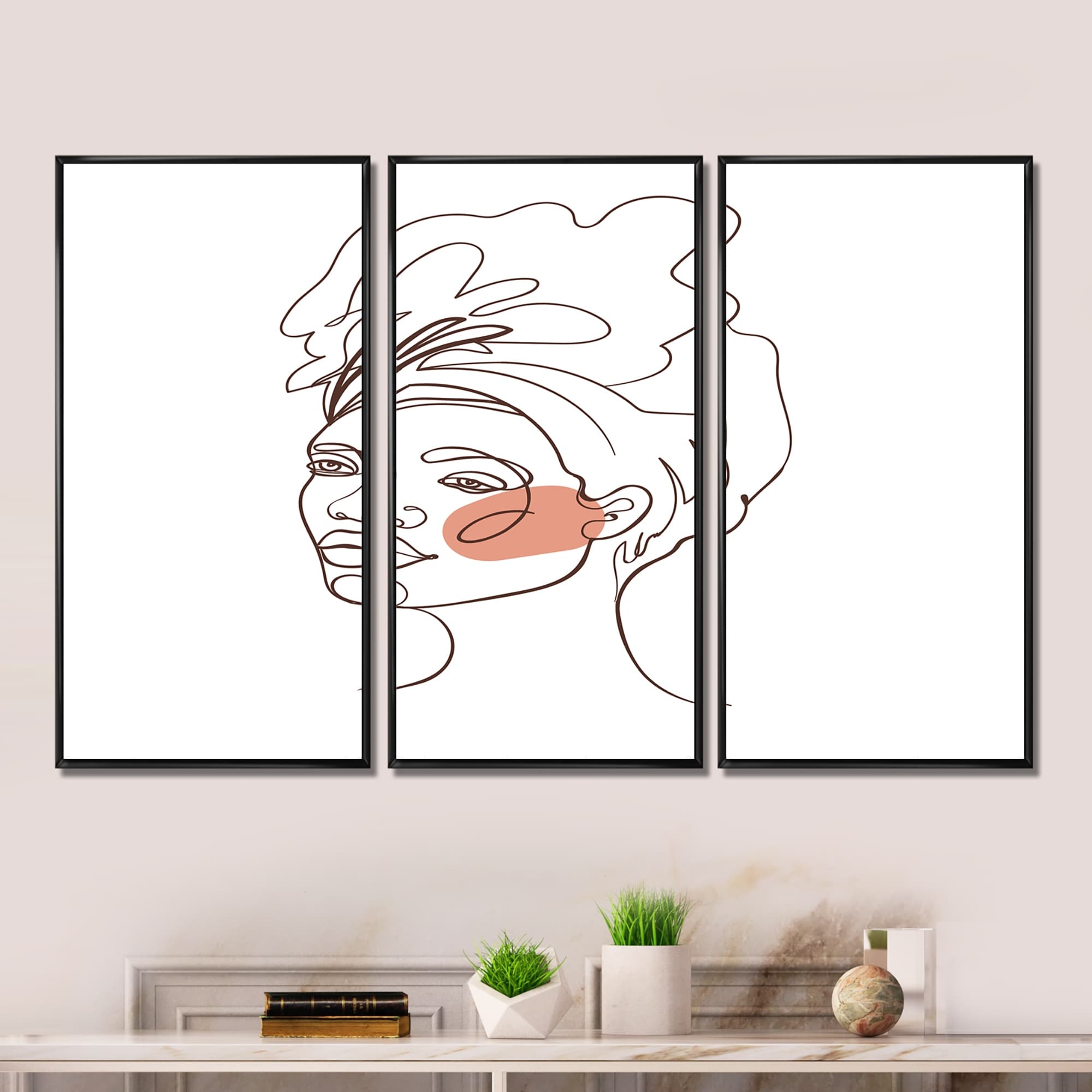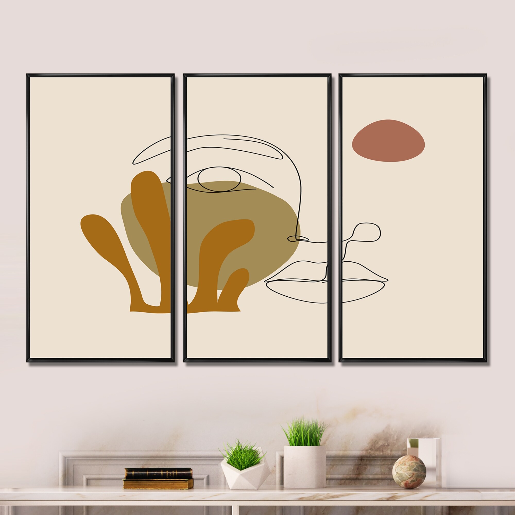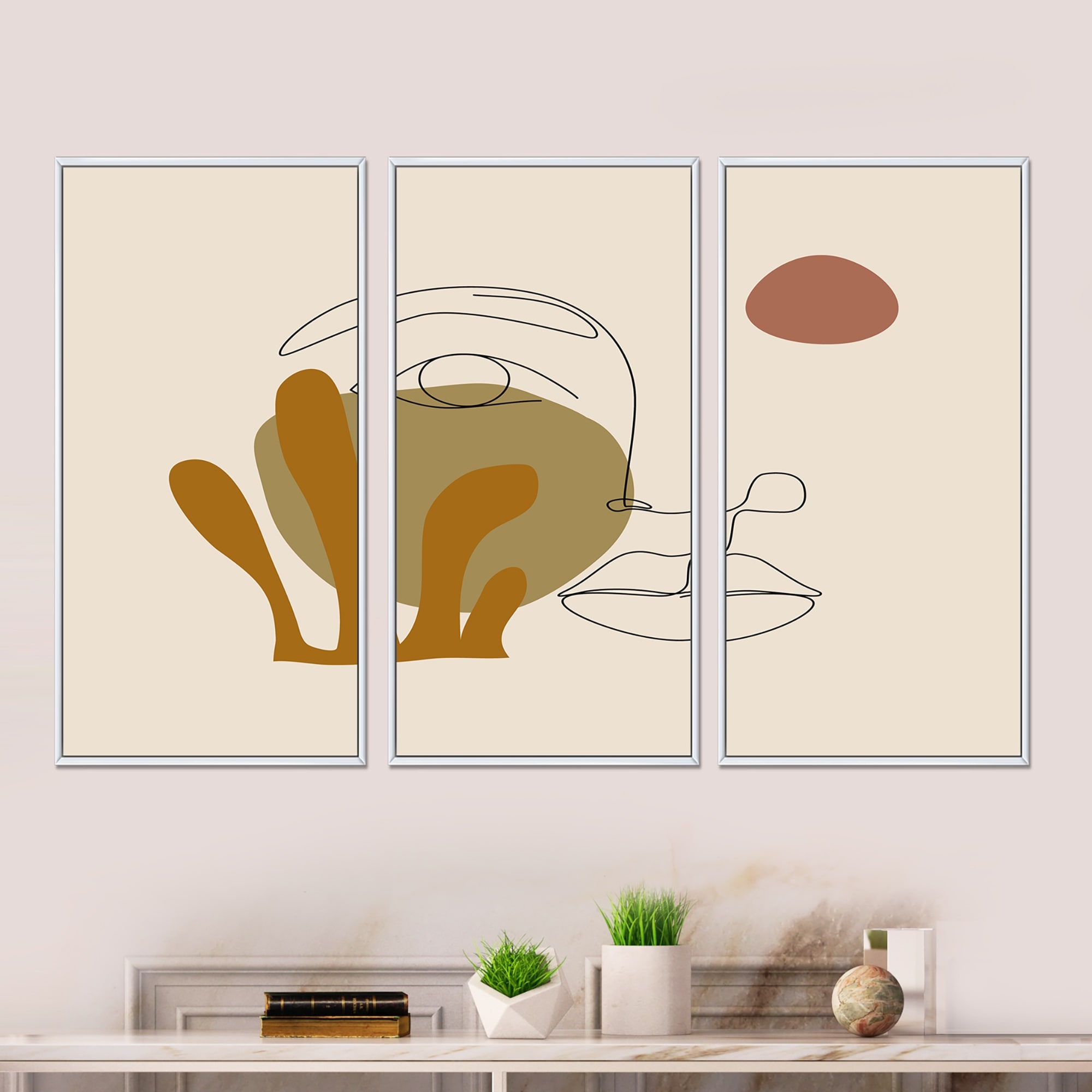 Designart "One Line Art Portrait of Woman in Terracotta Tones" Modern Framed Wall Art Set of 3 - 4 Colors of Frames