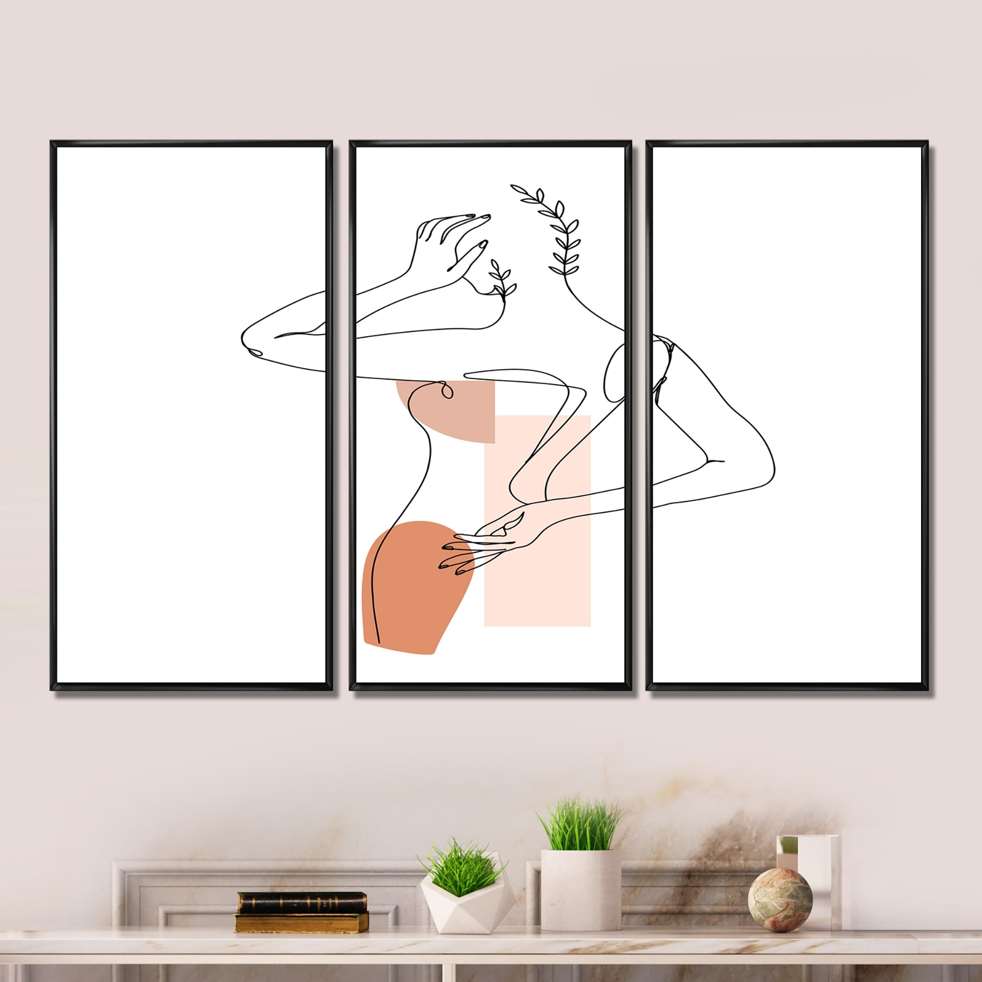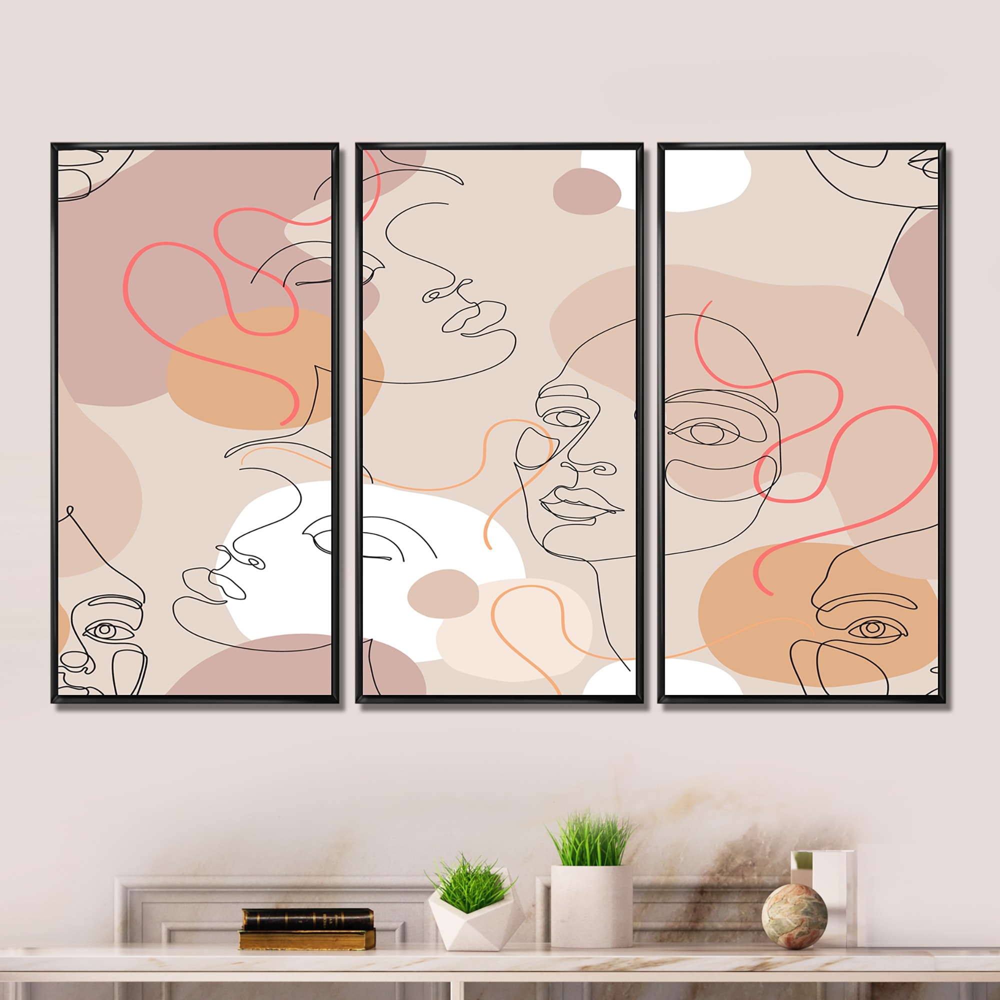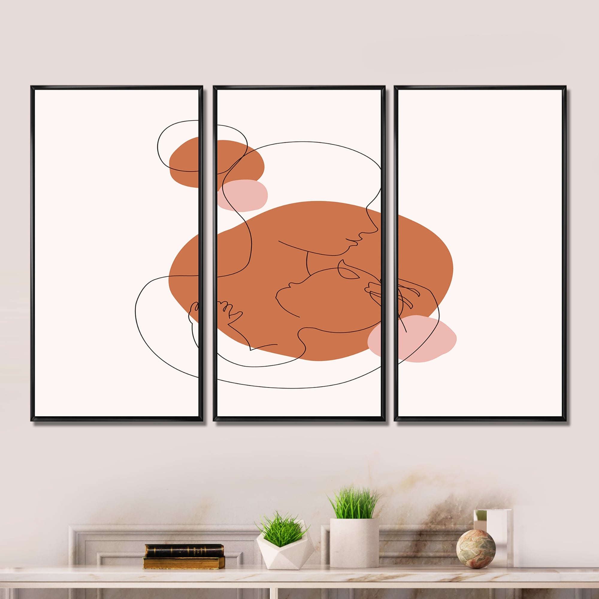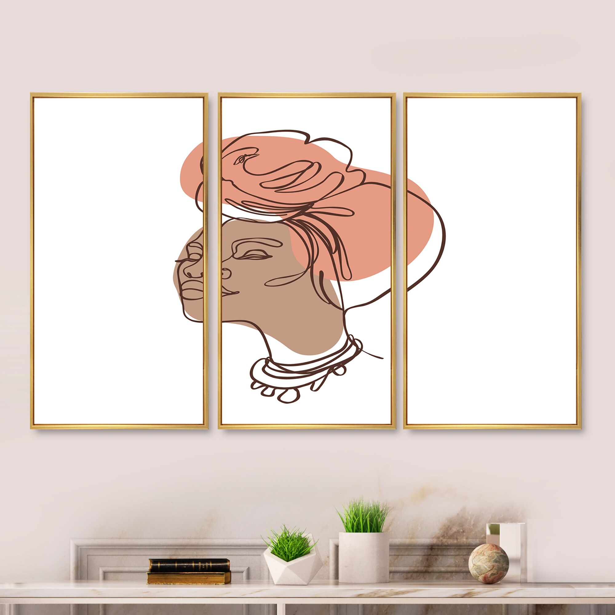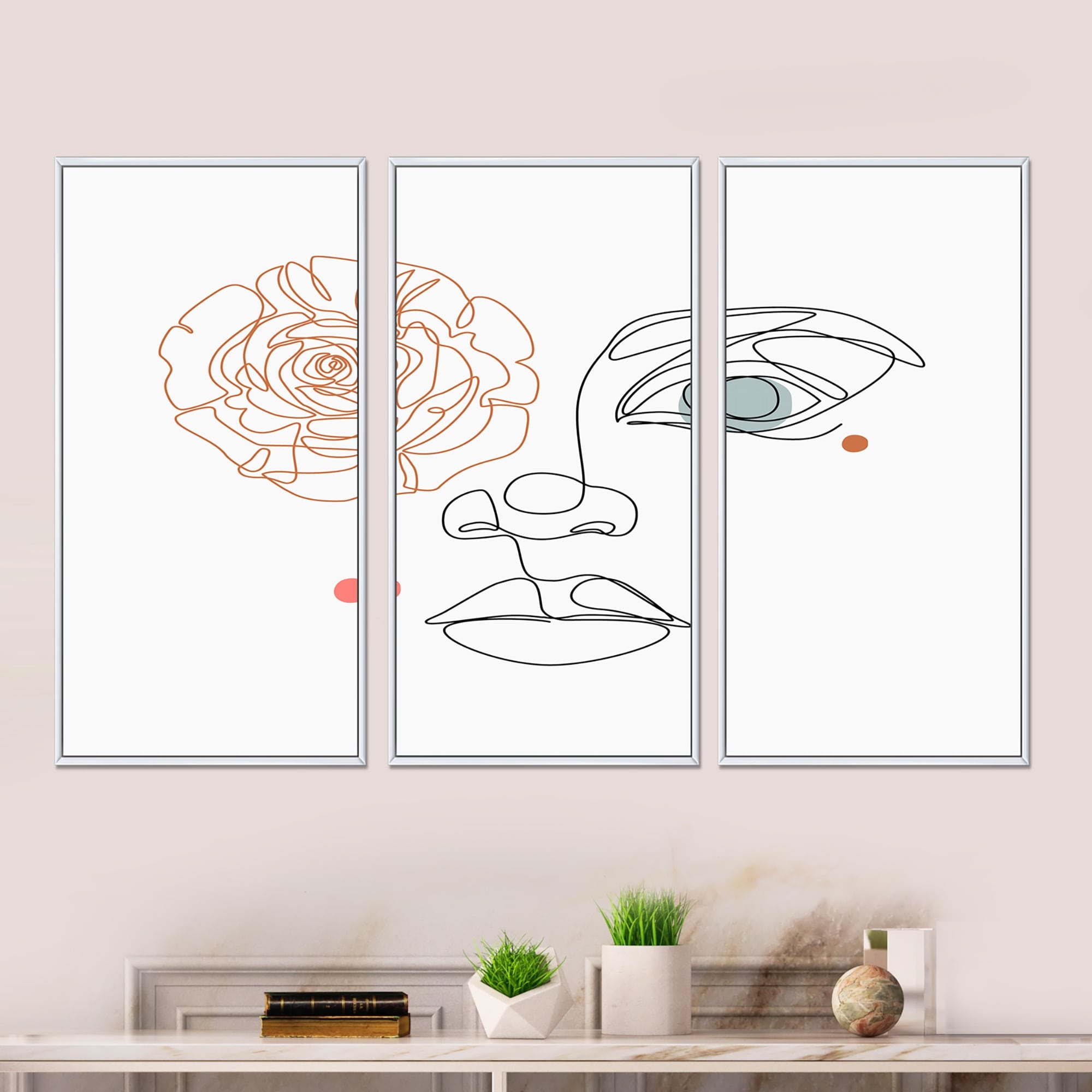 Designart "One Line Art Portrait of Woman in Terracotta Tones" Modern Framed Wall Art Set of 3 - 4 Colors of Frames