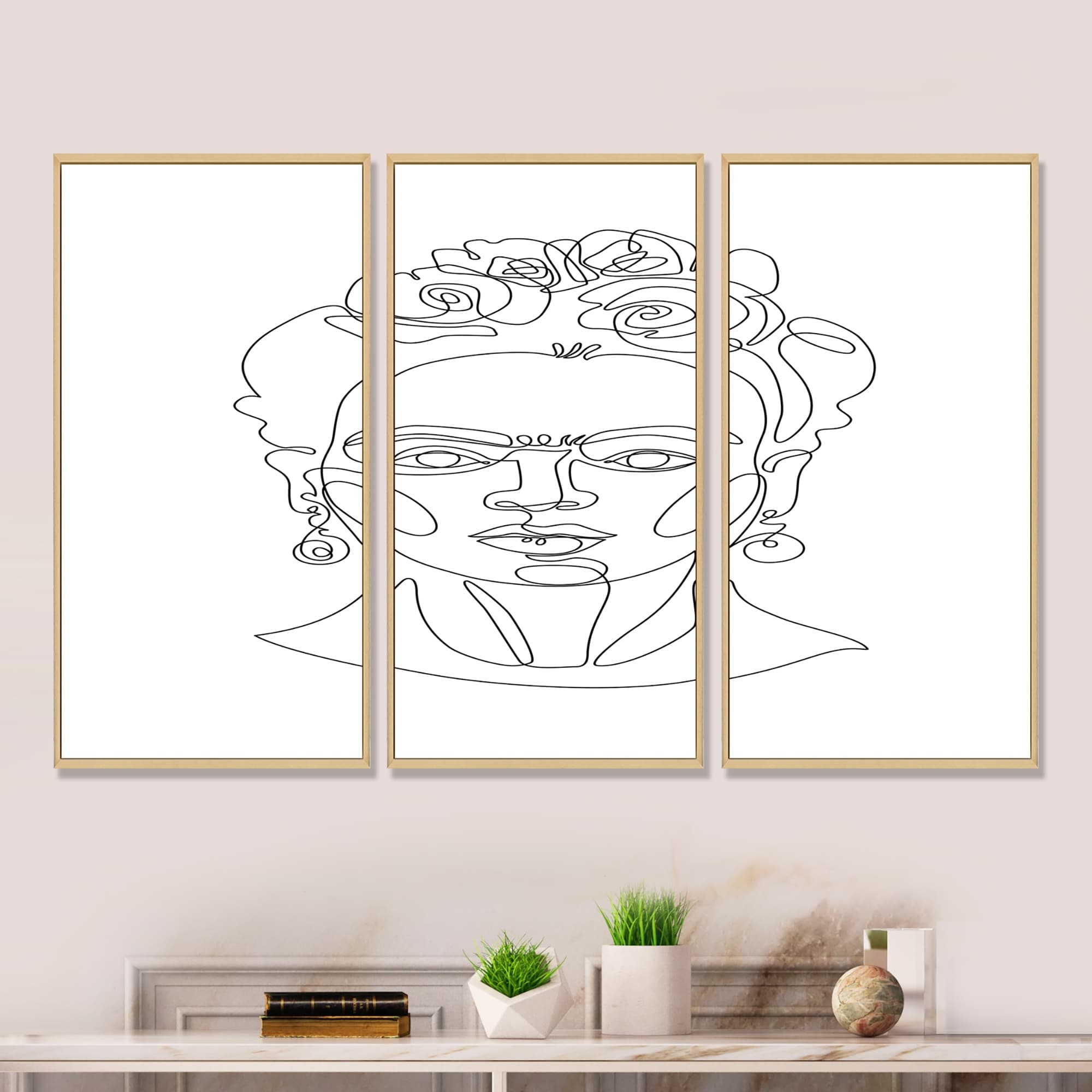 Designart "Frida Kahlo One Line Art in Flower Wreath" Glam Framed Wall Decor Set of 3 - 4 Colors of Frames
