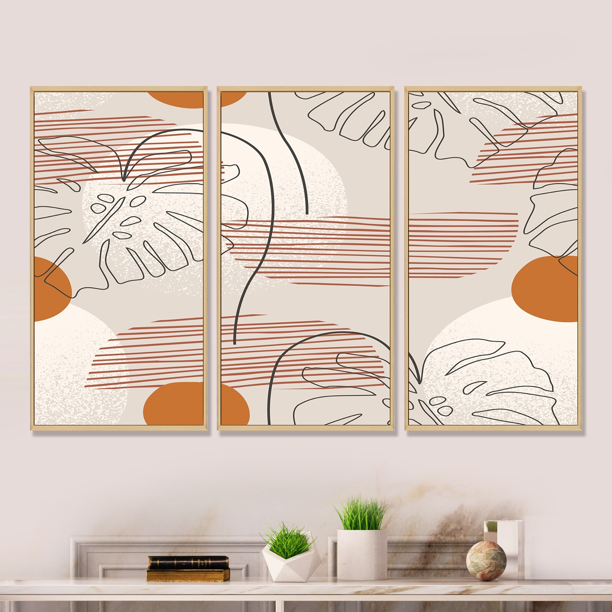 Designart "One Line Art Shapes & Abstract Monstera Leaf" Modern Framed Art Set of 3 - 4 Colors of Frames