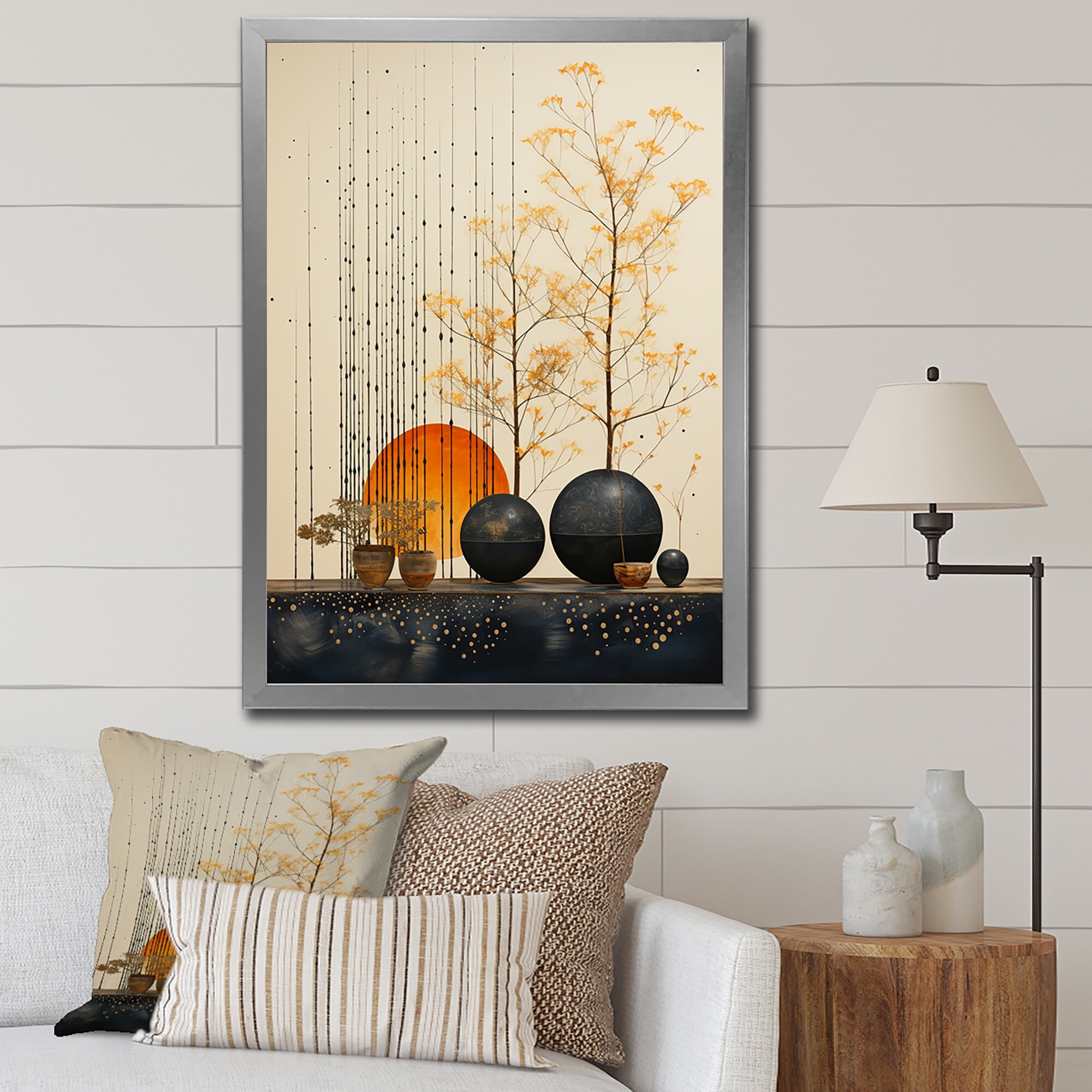 Designart "Grey Orange Mid Century Minimalist Oasis II" Abstract Collages Framed Wall Art Living Room