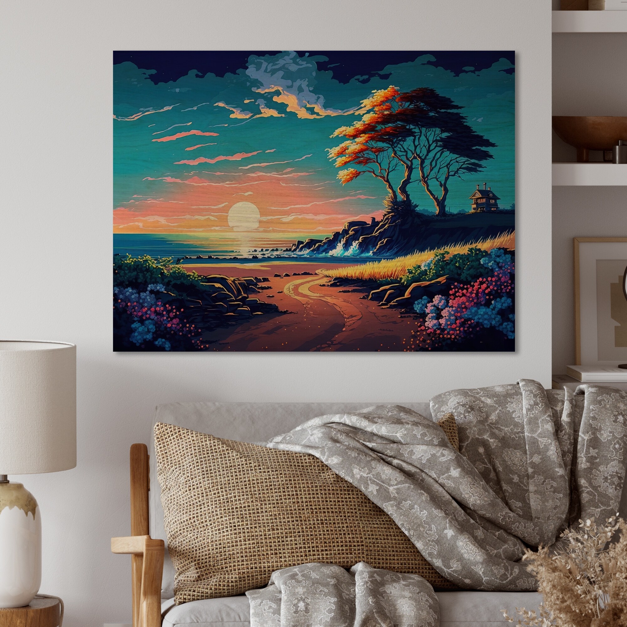 Designart 'Modern Sunset in Vector Style IV' Modern Landscape Beach Wood Wall Art - Natural Pine Wood