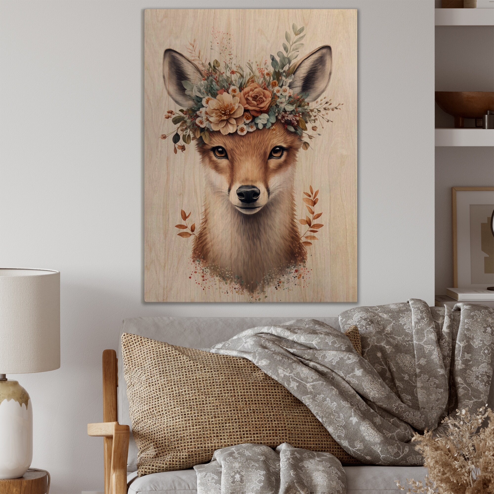 Designart 'Cute Baby Fox With Floral Crown IV' Animals Fox Wood Wall Art - Natural Pine Wood
