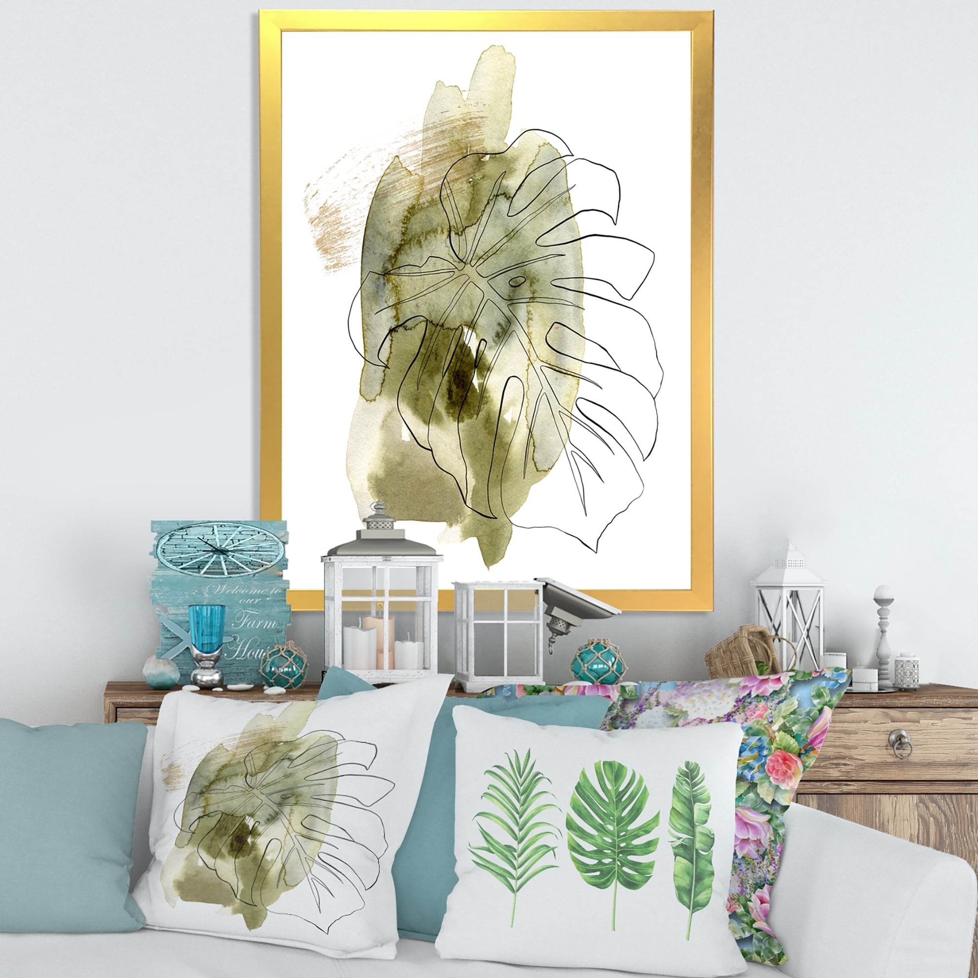 Designart "Line Art Monstera Branch Tropical Abstract Leaves" Traditional Framed Art Print