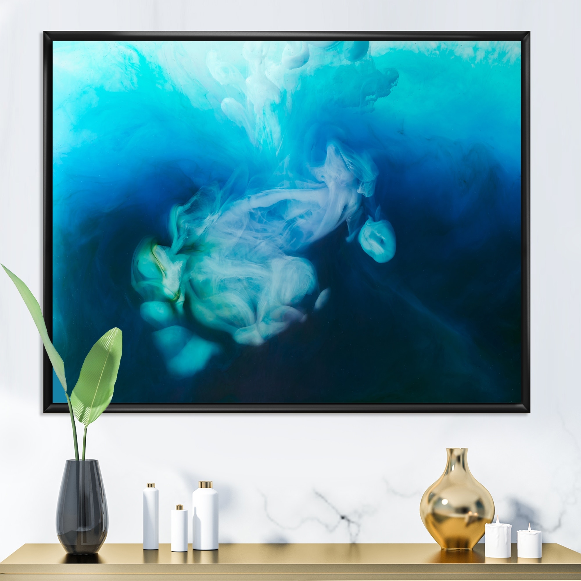 Designart "Blue Ink Mixing in Water" Abstract Framed Canvas Art Print