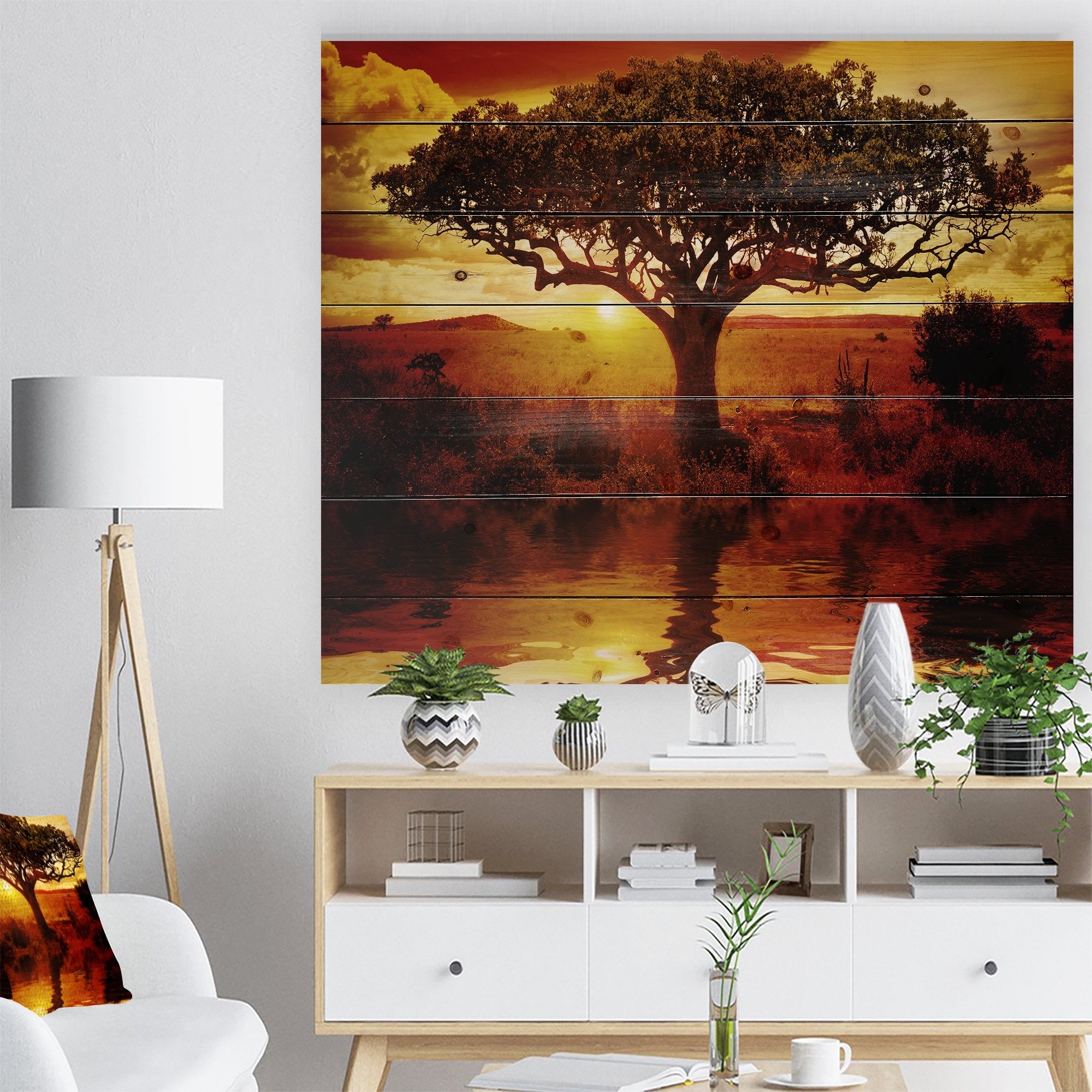 Designart 'Lonely Tree in African Sunset' African Landscape Print on Natural Pine Wood - Yellow