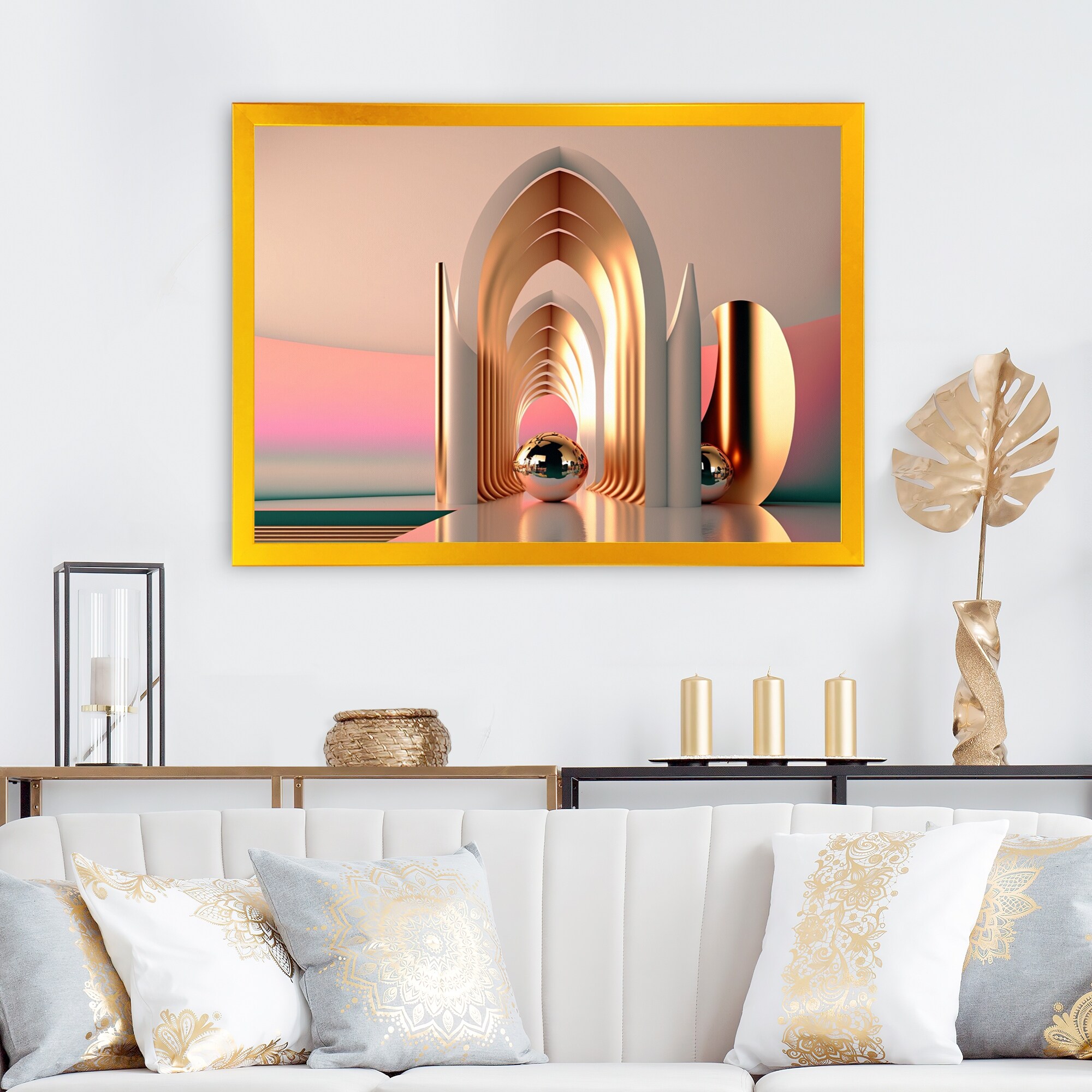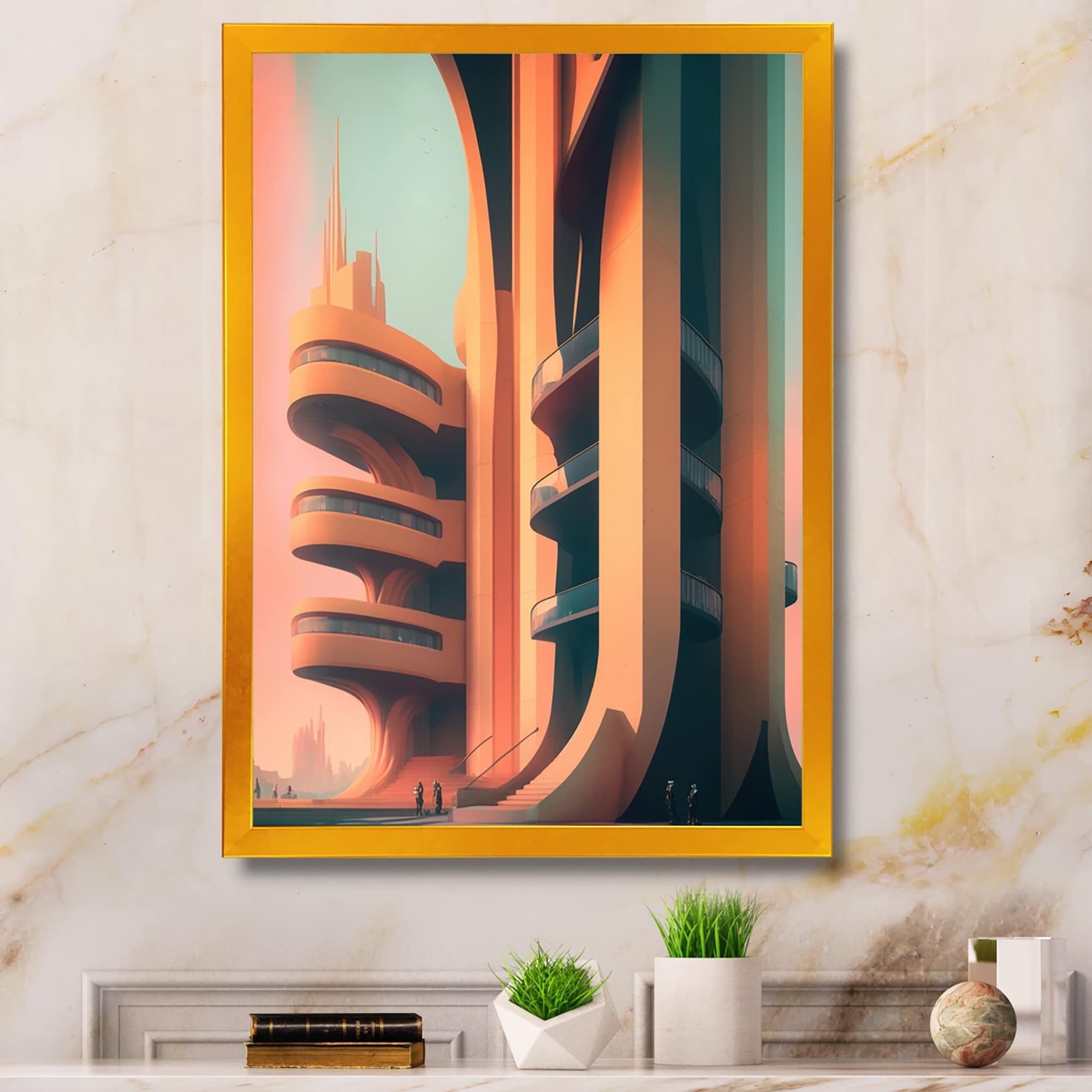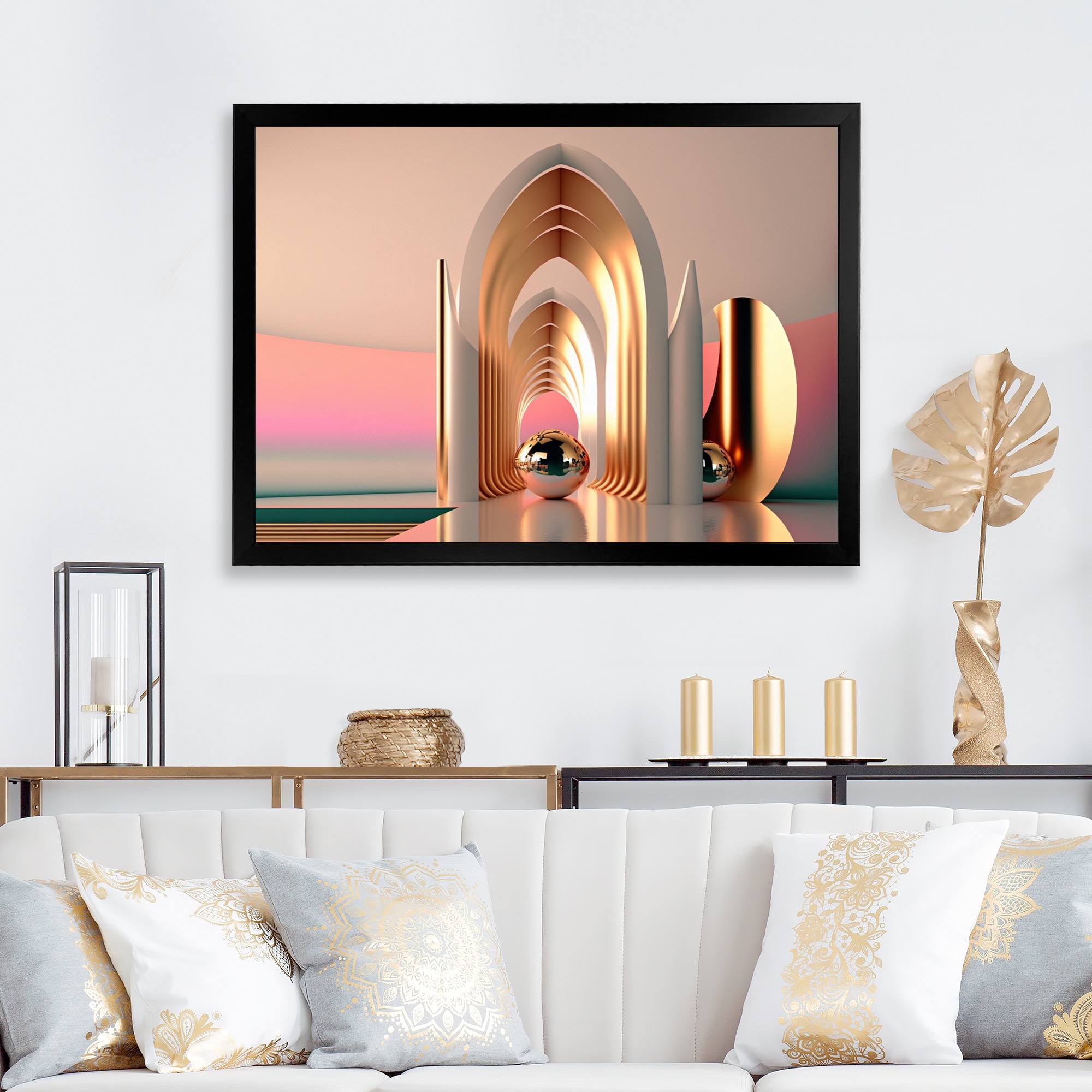 Designart "Futuristic Golden Globe Architecture III" Modern Abstract Framed Canvas Wall Art Print