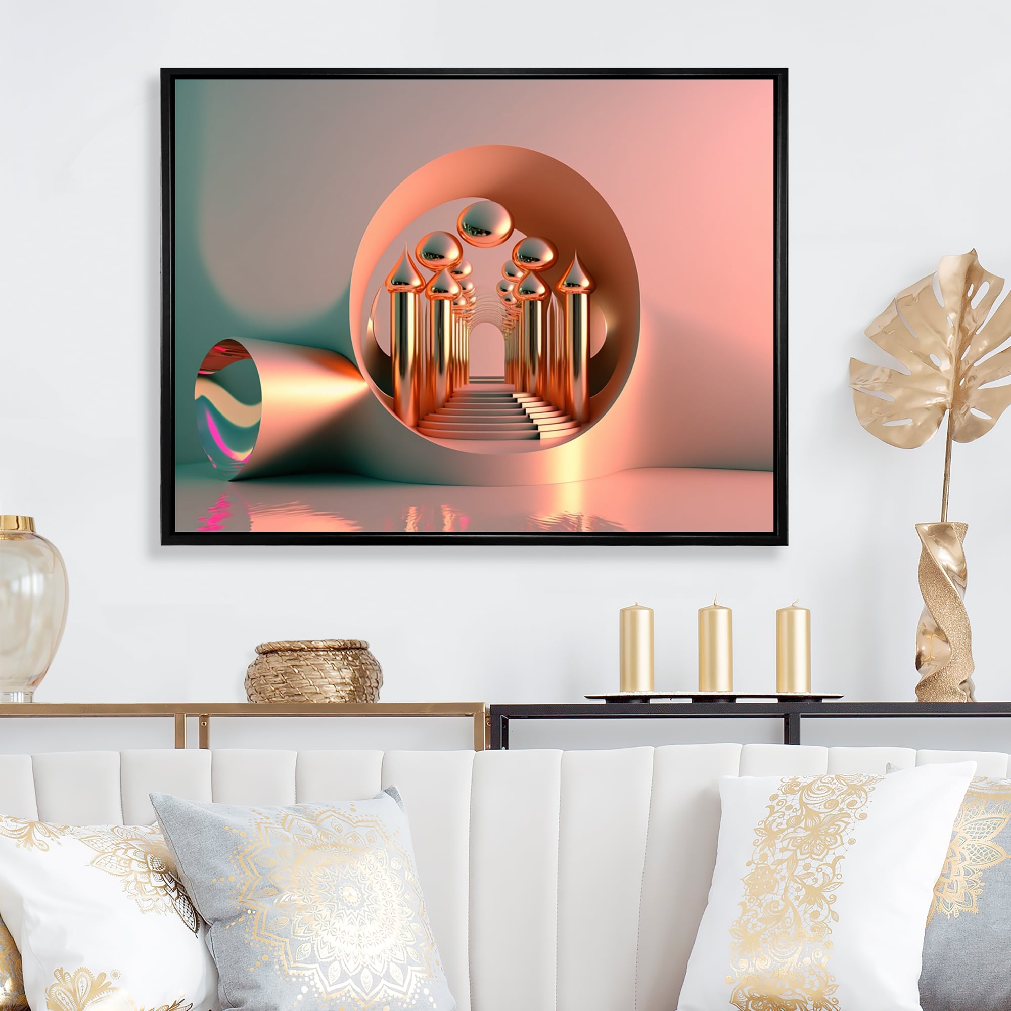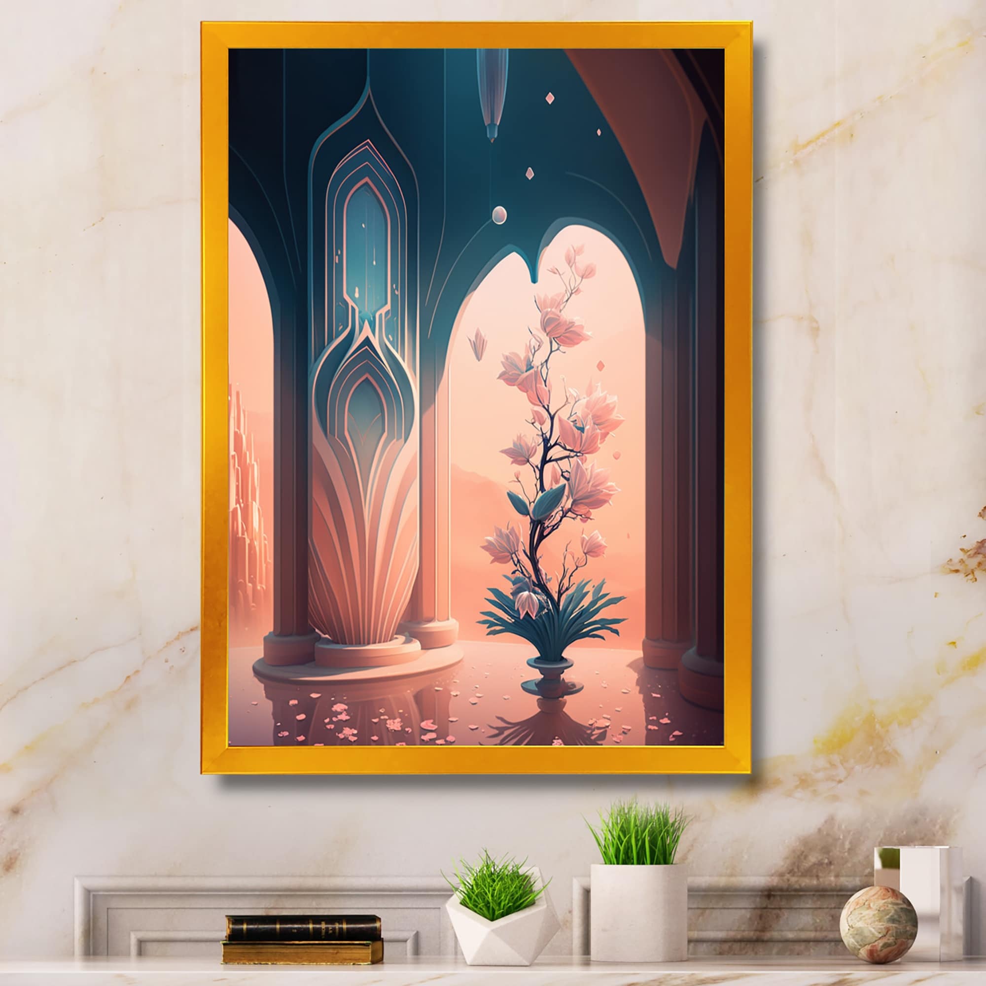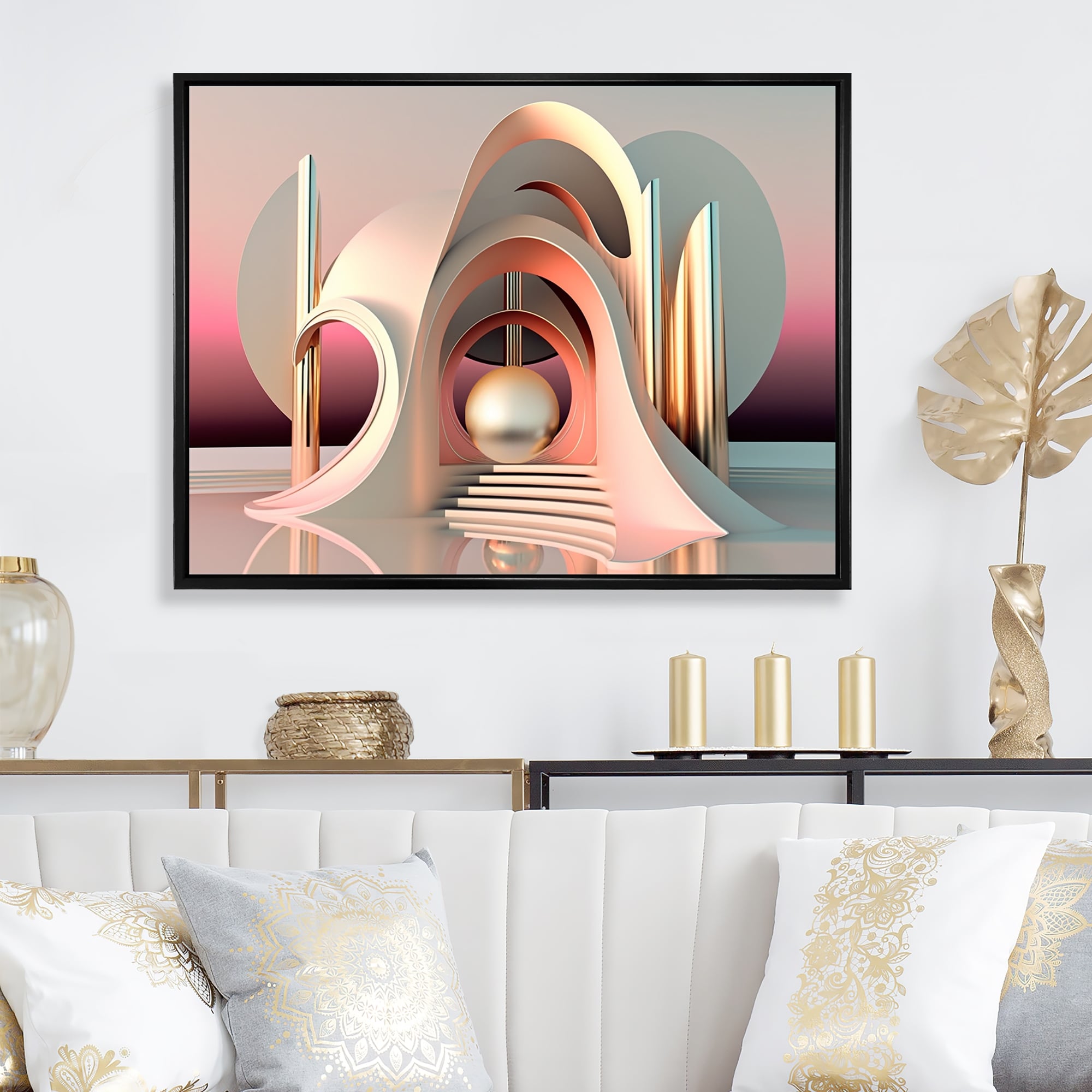 Designart "Futuristic Golden Globe Architecture III" Modern Abstract Framed Canvas Wall Art Print