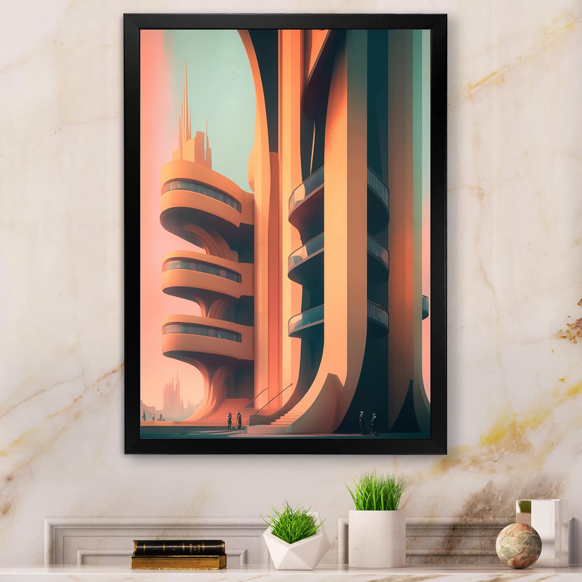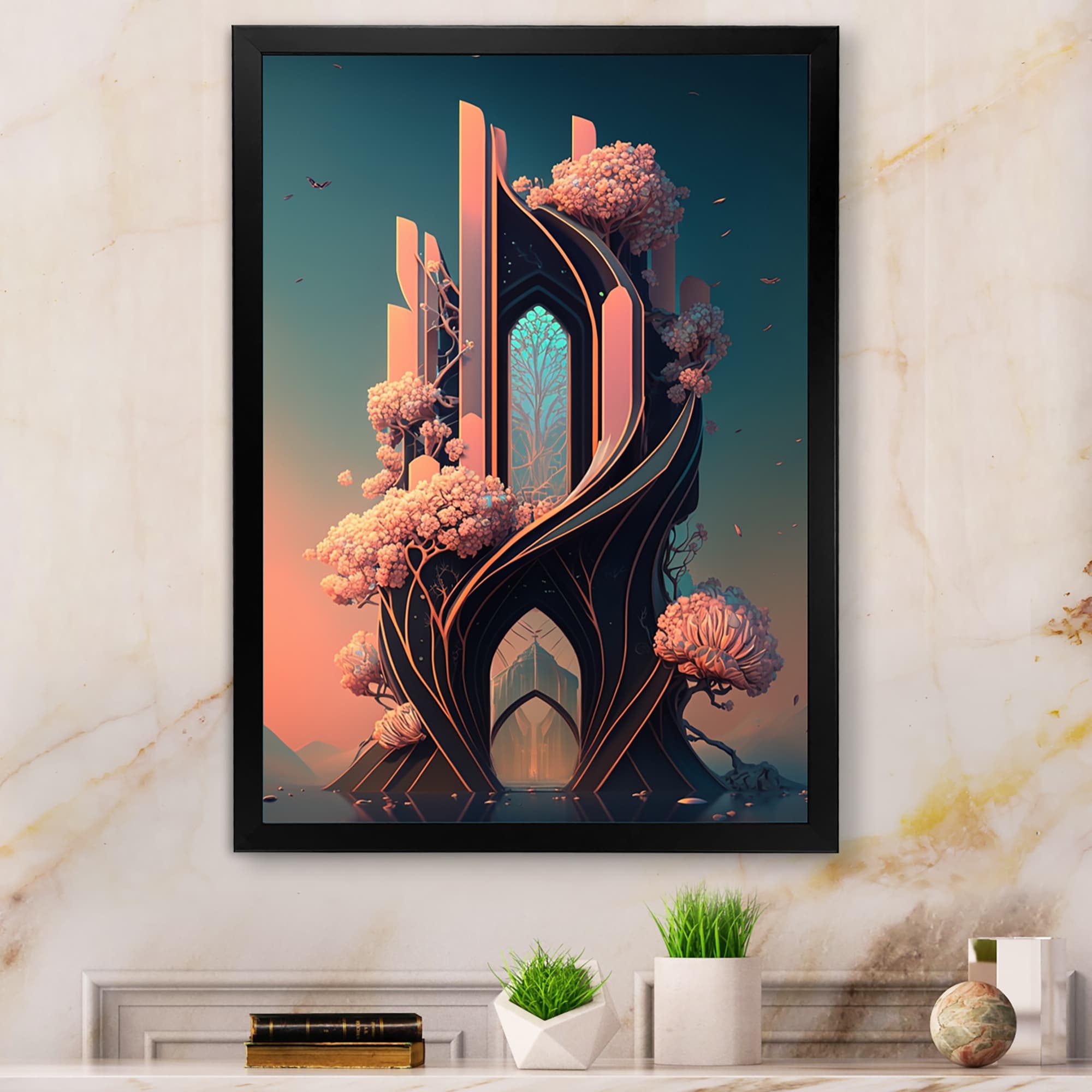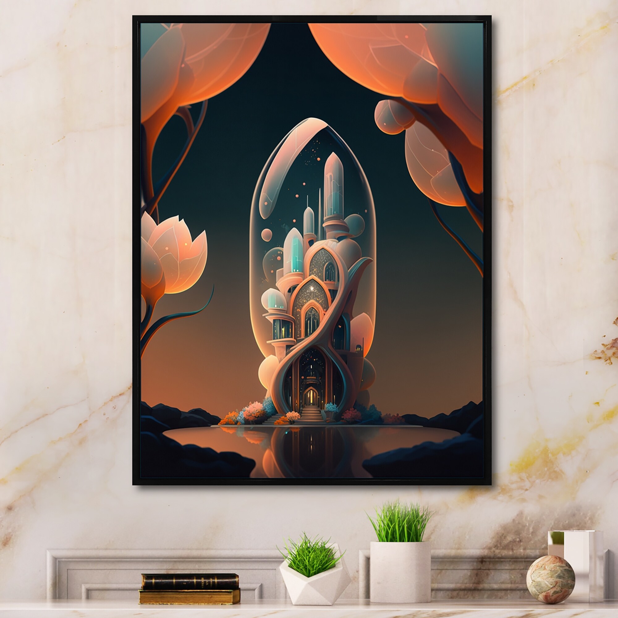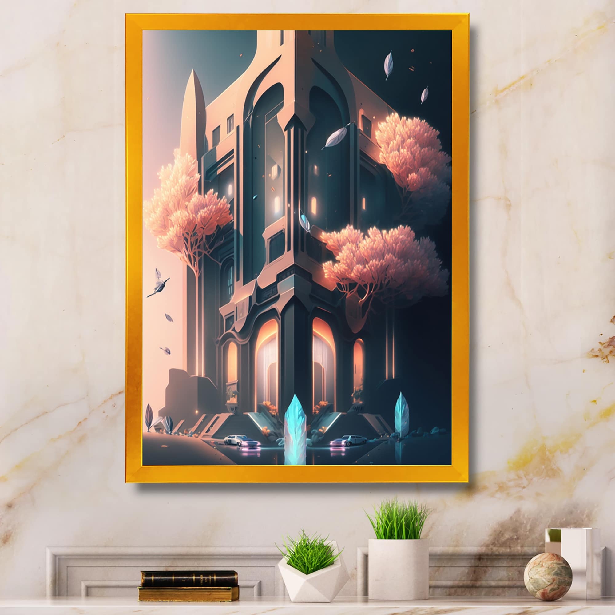 Designart "Futristic Architecture With Flowers IV" City Fantasy Framed Art Print