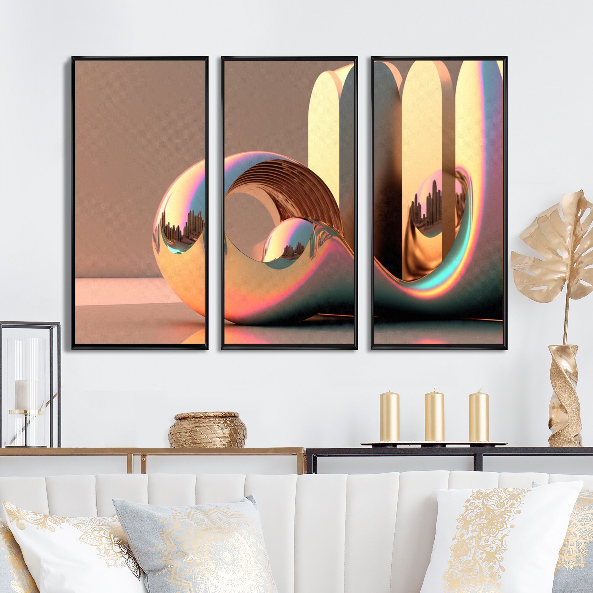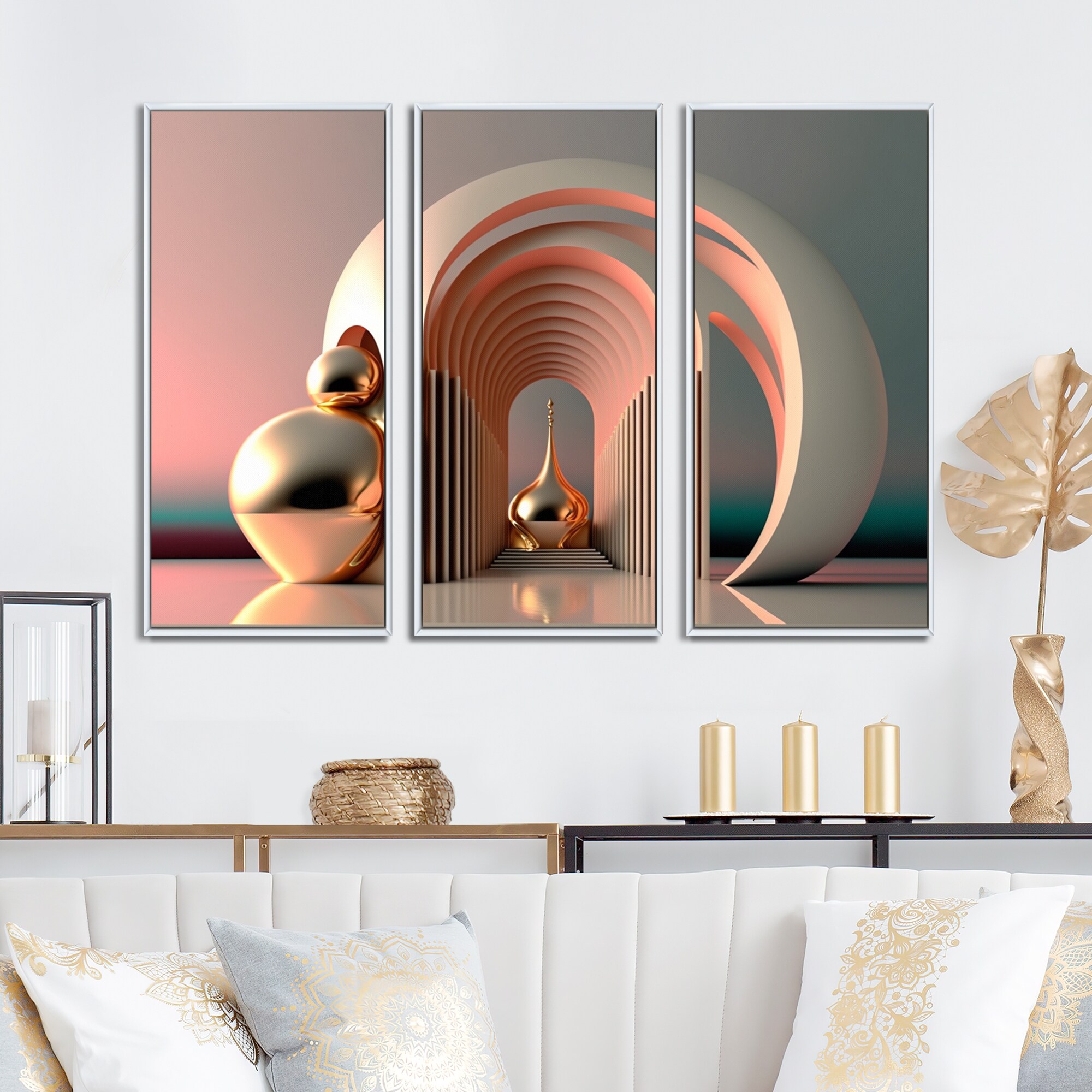 Designart "Futuristic Golden Globe Architecture V" Modern Abstract Framed Canvas Wall Art Print - 3 Panels