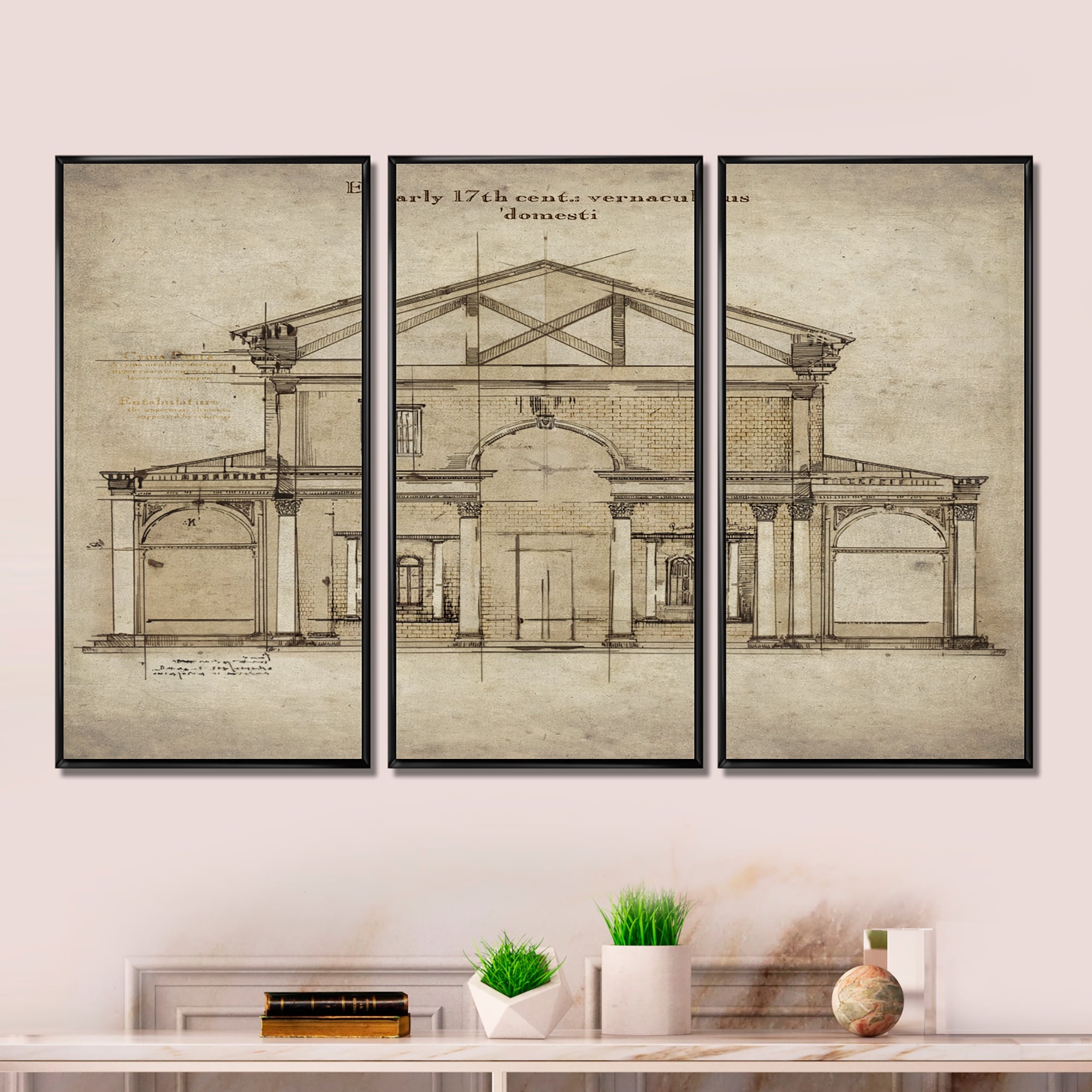 Designart "Antique Facade Old Style Architecture Sketch I" Traditional Framed Wall Decor Set of 3 - 4 Colors of Frames