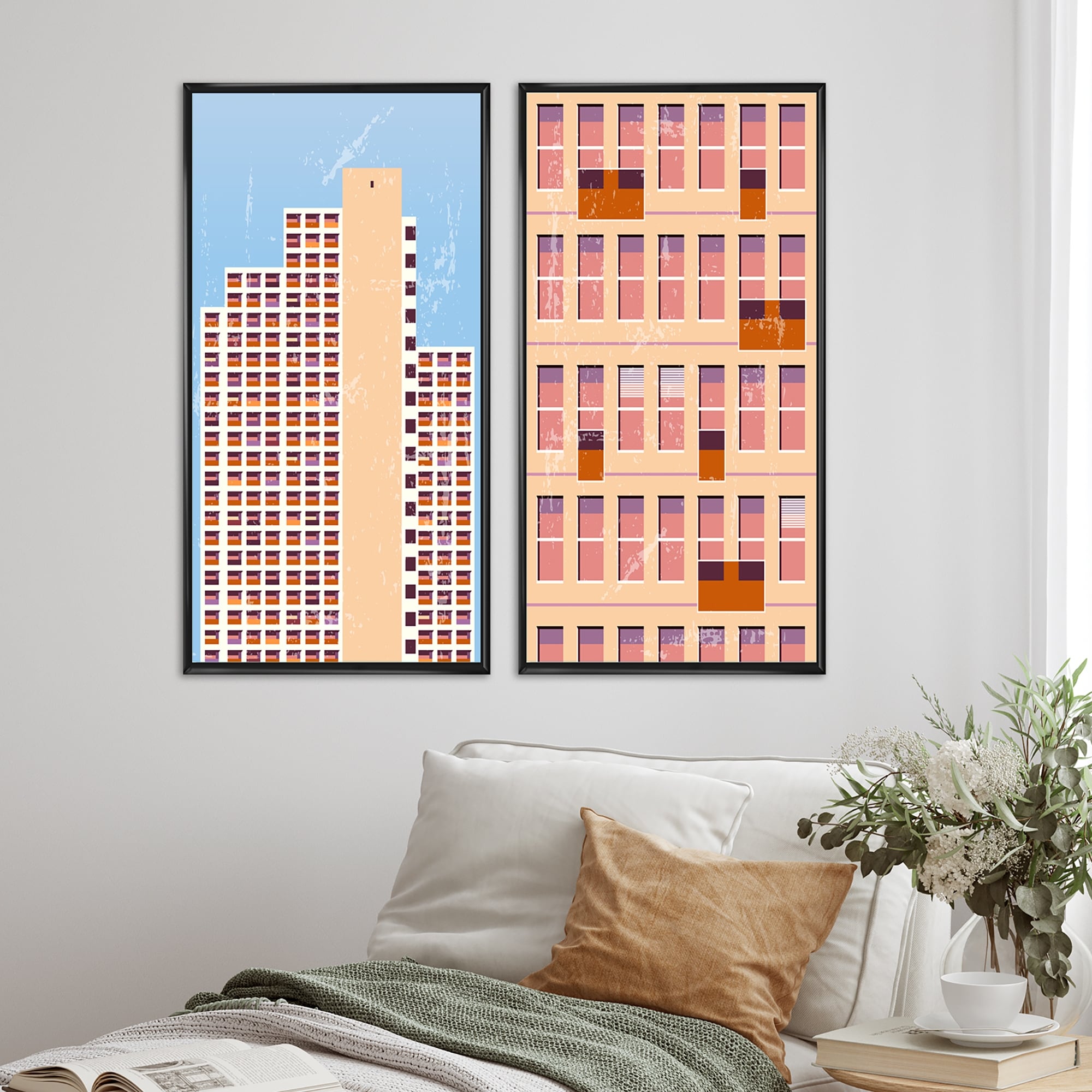 Designart "Graphic Vintage Minimal Architecture II" Geometric Framed Art Set of 2 Pieces