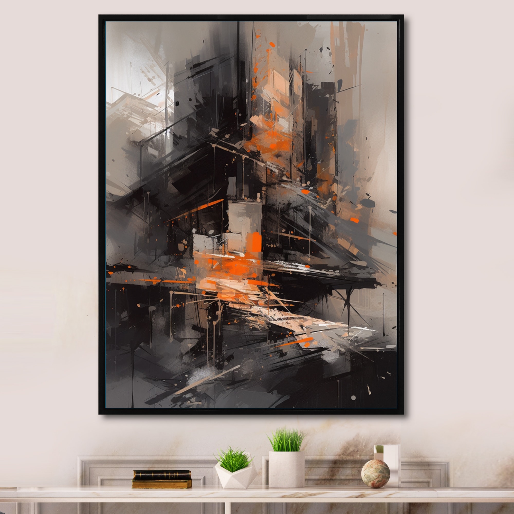 Designart "Black And Orange Architectural Tapestry" City Art Deco Framed Canvas Print