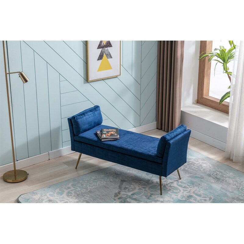 Mid Century Upholstered Bench with Armrest, Solid Wood Frame and Golden Metal Legs for Living Room