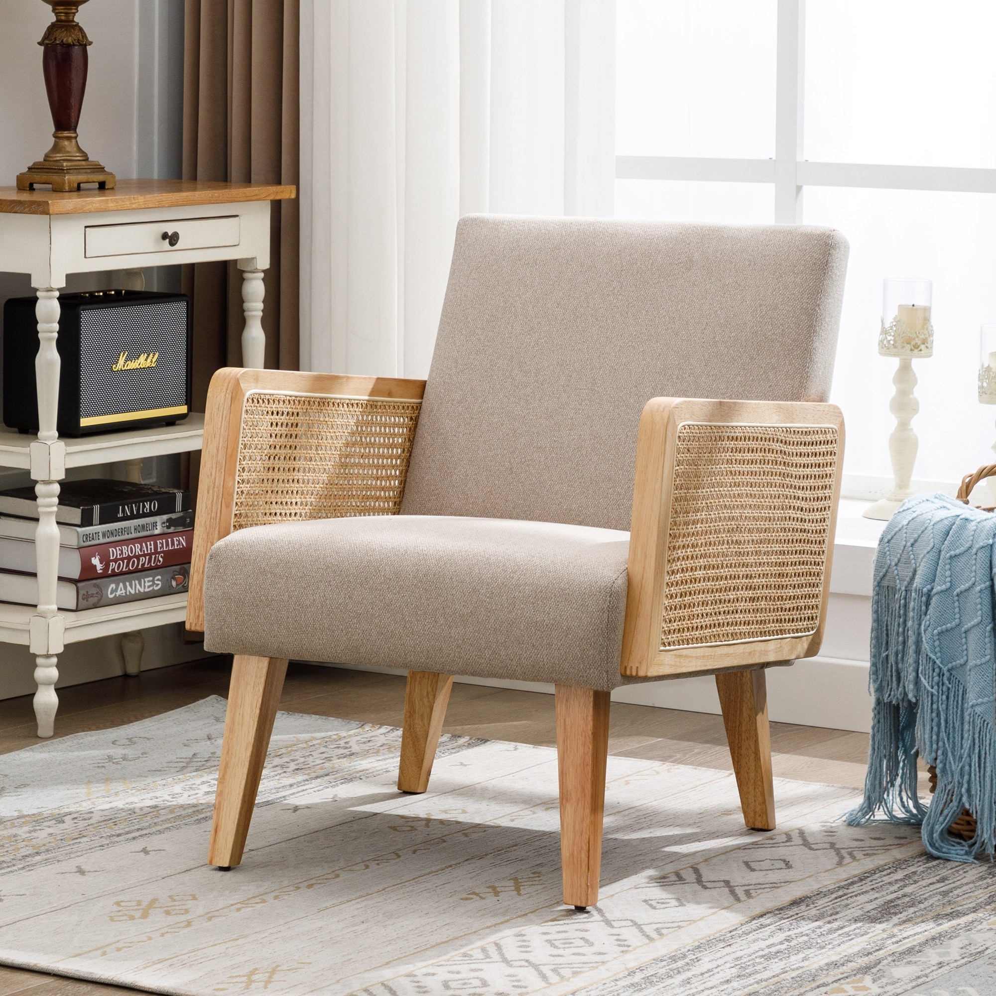 Rattan Armrest Fabric Upholstered Accent Chair for Living Room