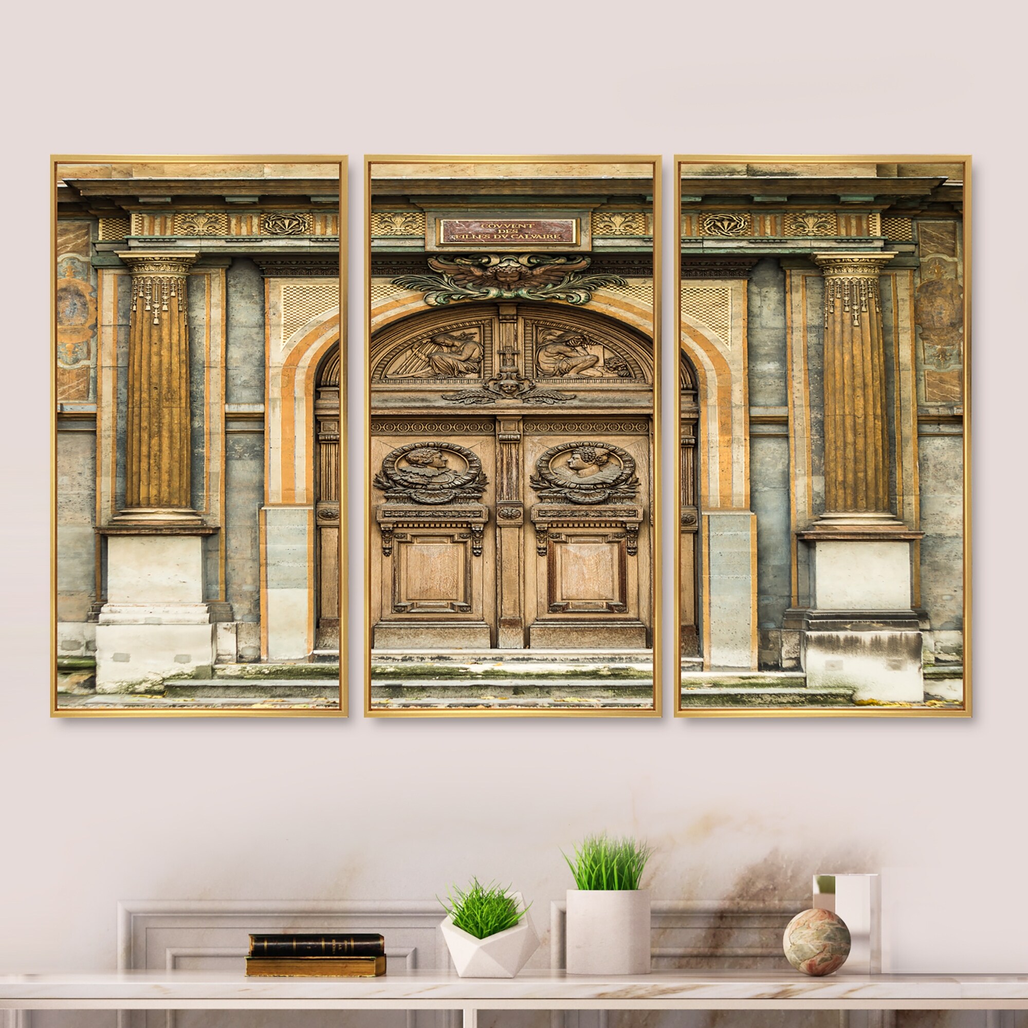 Designart "Old Wooden Door With Carvings in Paris, France" Traditional Framed Art Prints Set of 3 - 4 Colors of Frames