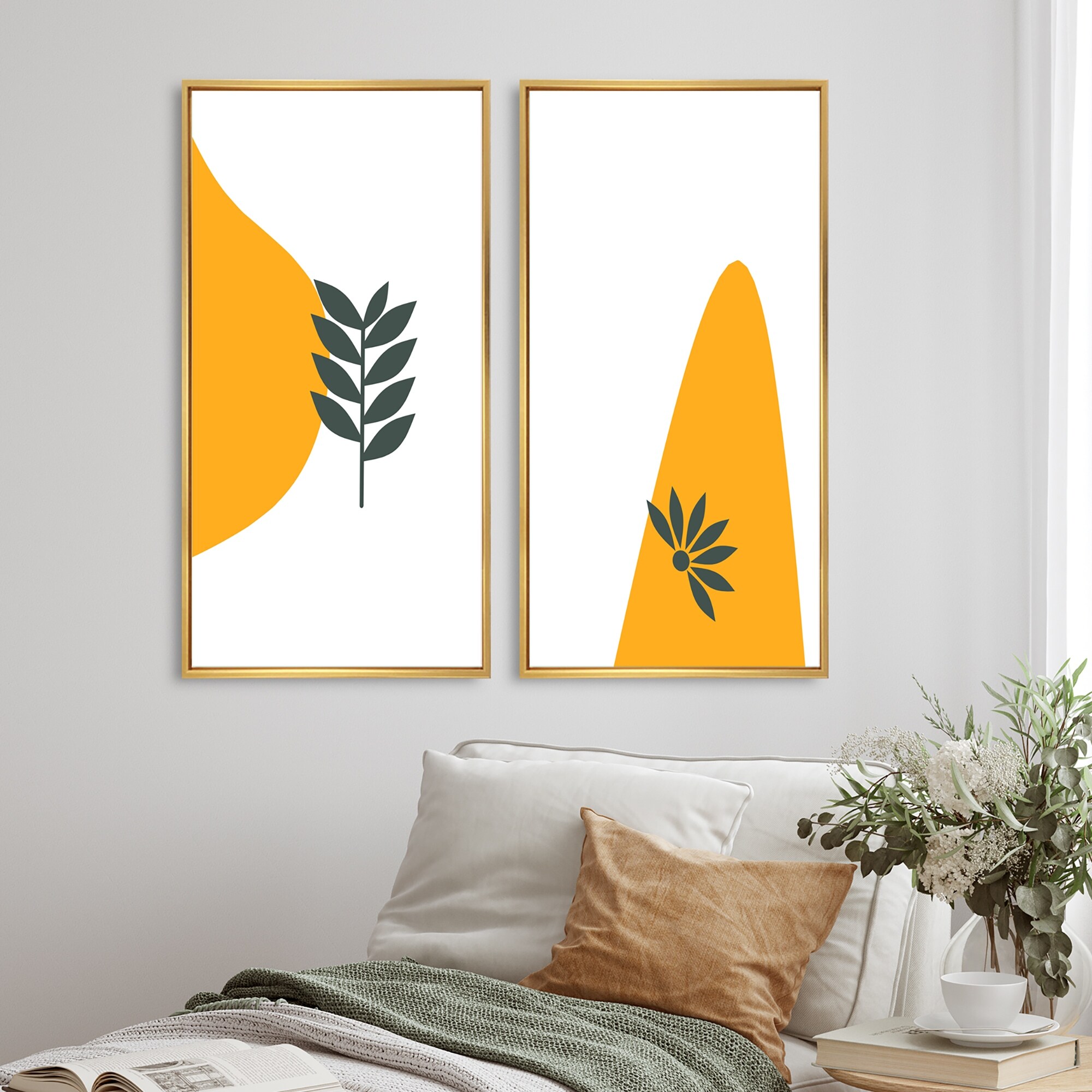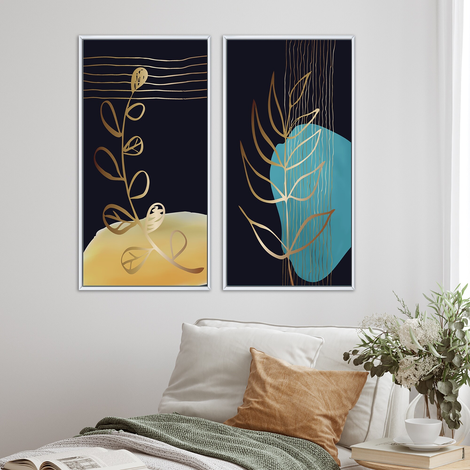 Designart "Botanical Golden Silhouettes on Black I" Abstract Framed Art Set of 2 Pieces