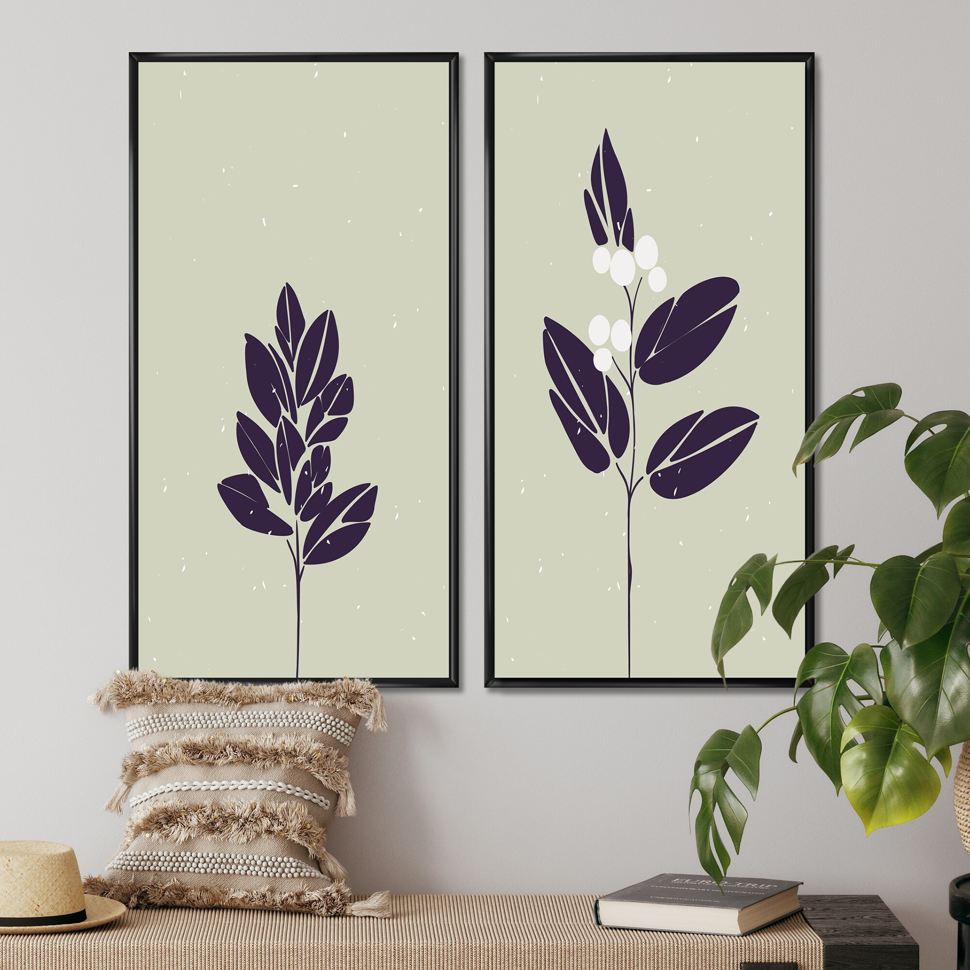 Designart "Vintage Flower Silhouette on Retro Green I" Geometric Framed Art Set of 2 Pieces