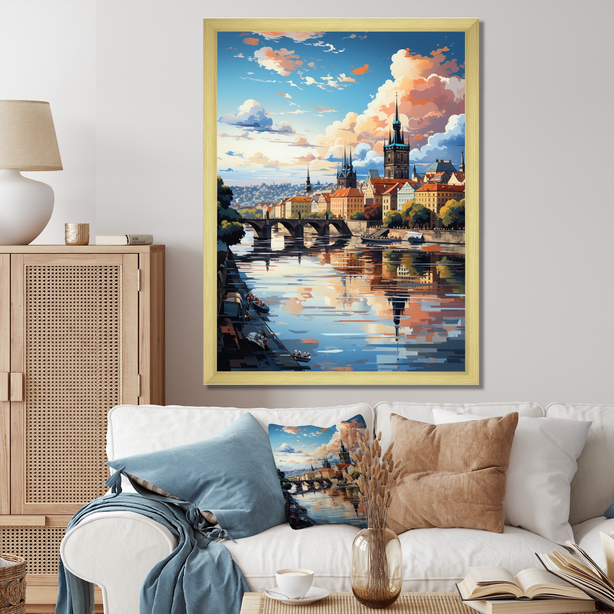 Designart "Blue Beige City Prague Popart" Prague Framed Canvas Wall Art