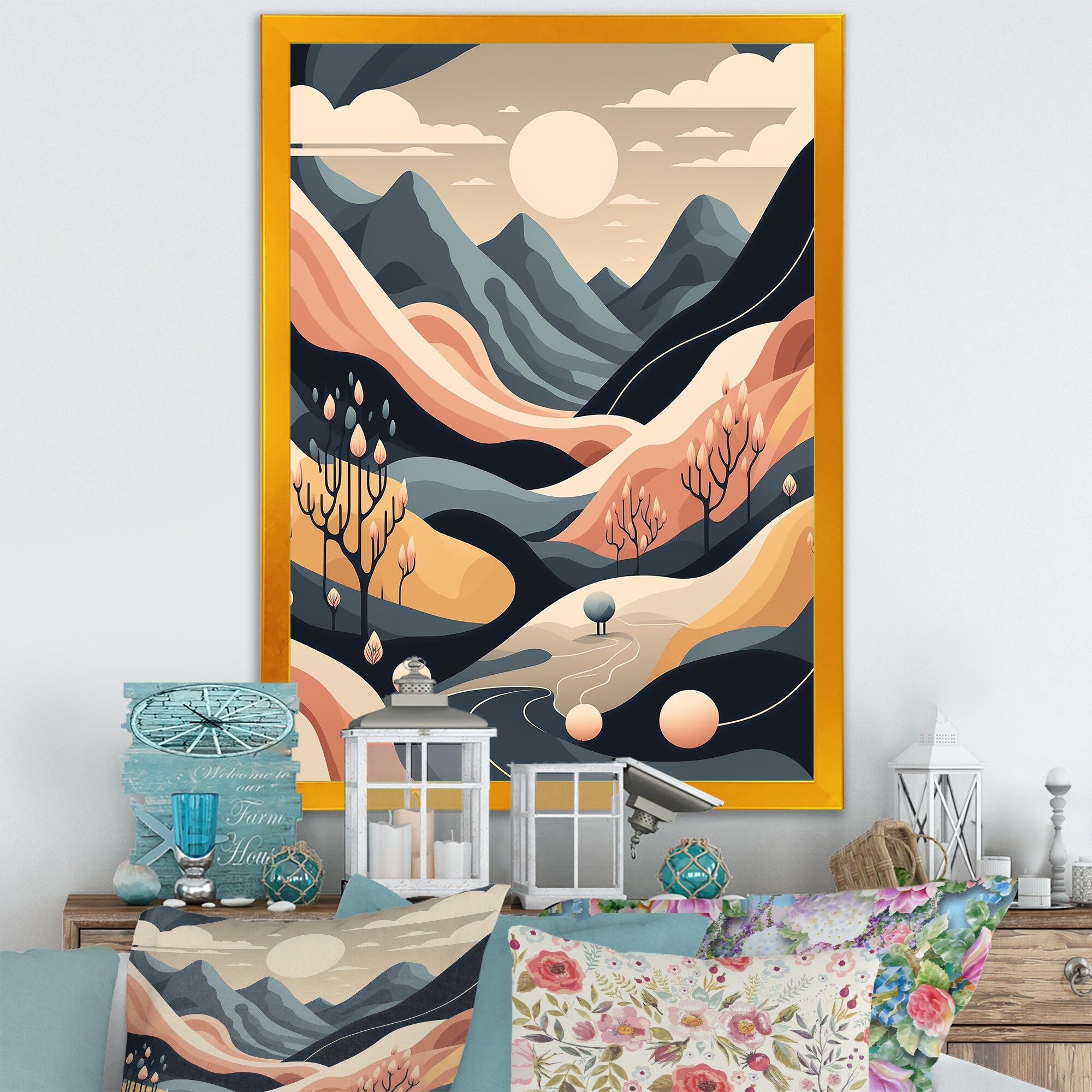 Designart "Yellow Graphic Moon in the Mountains V" Landscape Mountains Framed Art Print
