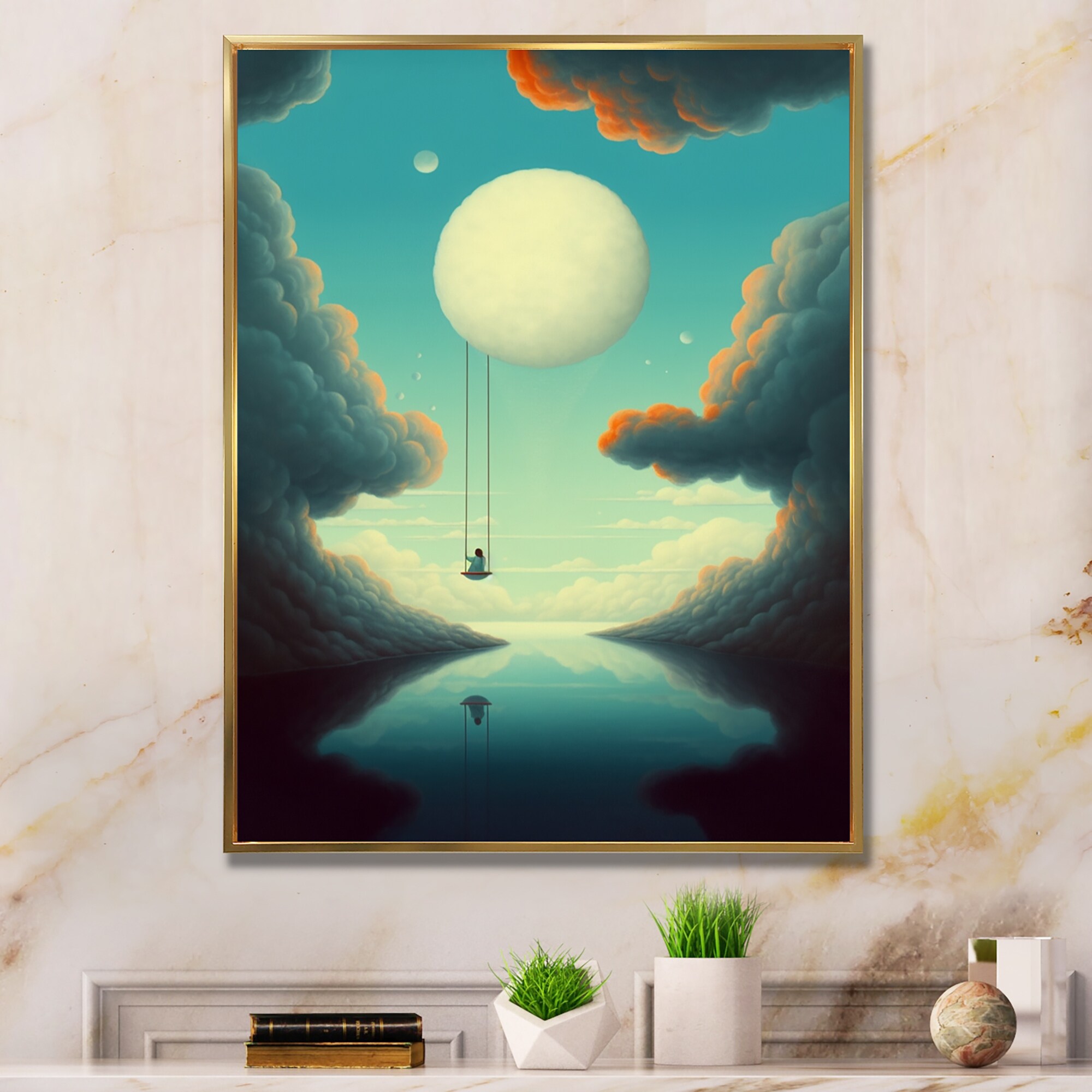 Designart "Swinging In the Sky" Surrealism Landscape Framed Canvas Art Print