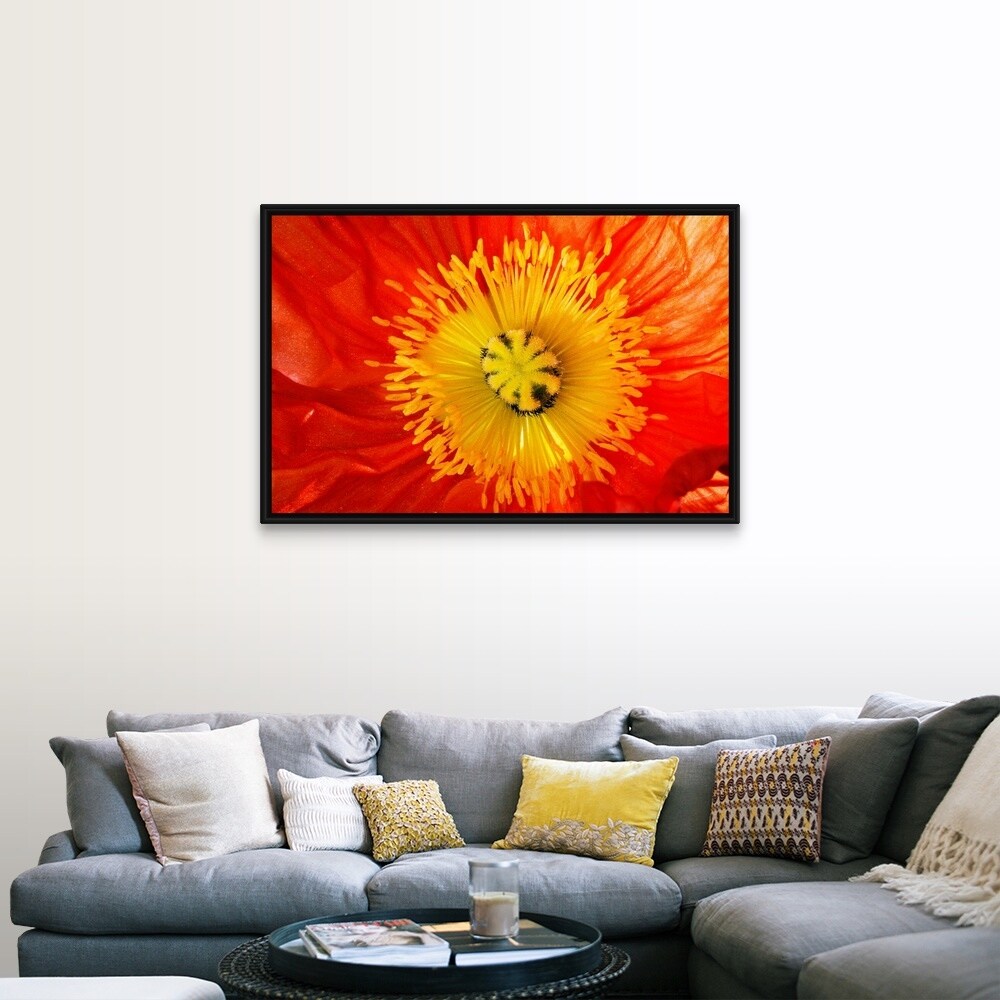 "Close up of red and yellow flower" Black Float Frame Canvas Art