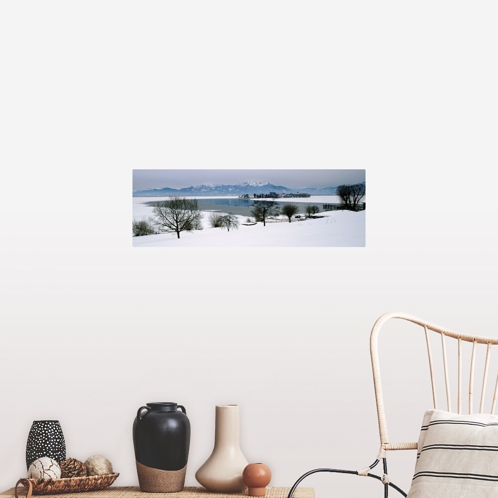 "Frozen lake in front of snowcapped mountains, Chiemsee, Bavaria, Germany" Poster Print