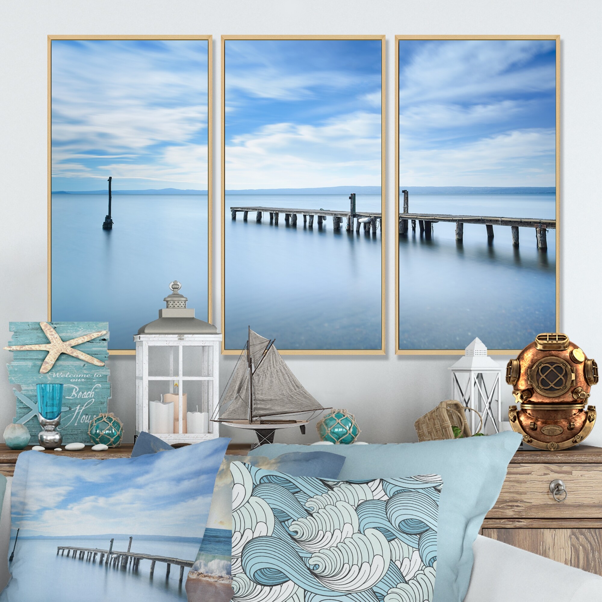 Designart "Wooden Piers by Blue Sea" Seascape Framed Canvas Art Print