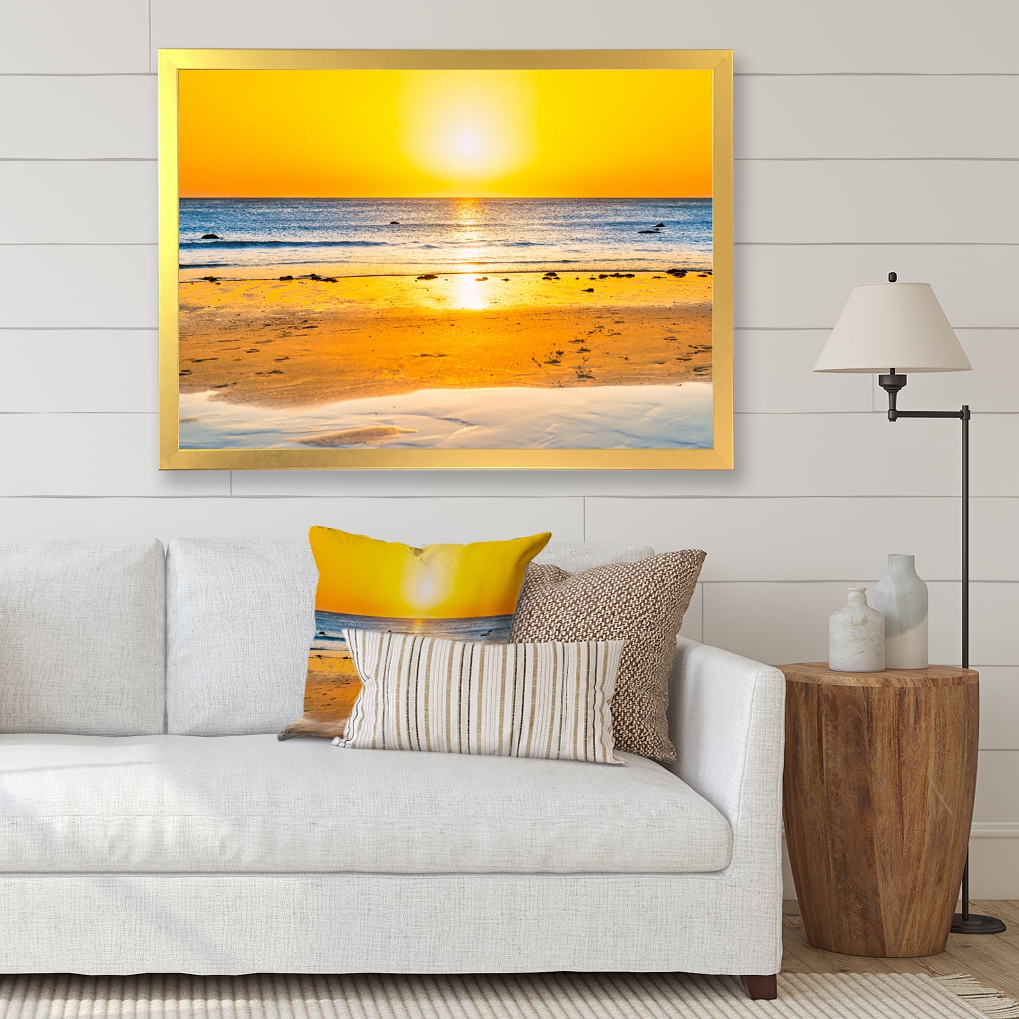 Designart "Sunset On Beautiful Sand Beach With Blue Sea Water" Nautical & Coastal Framed Art Print