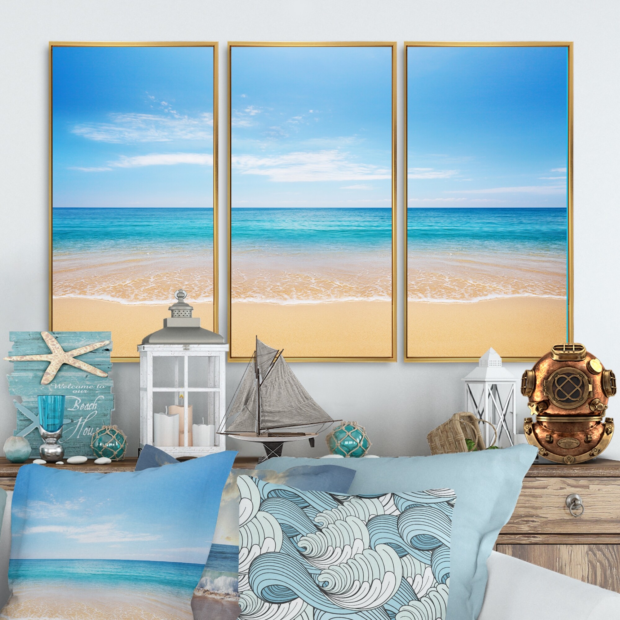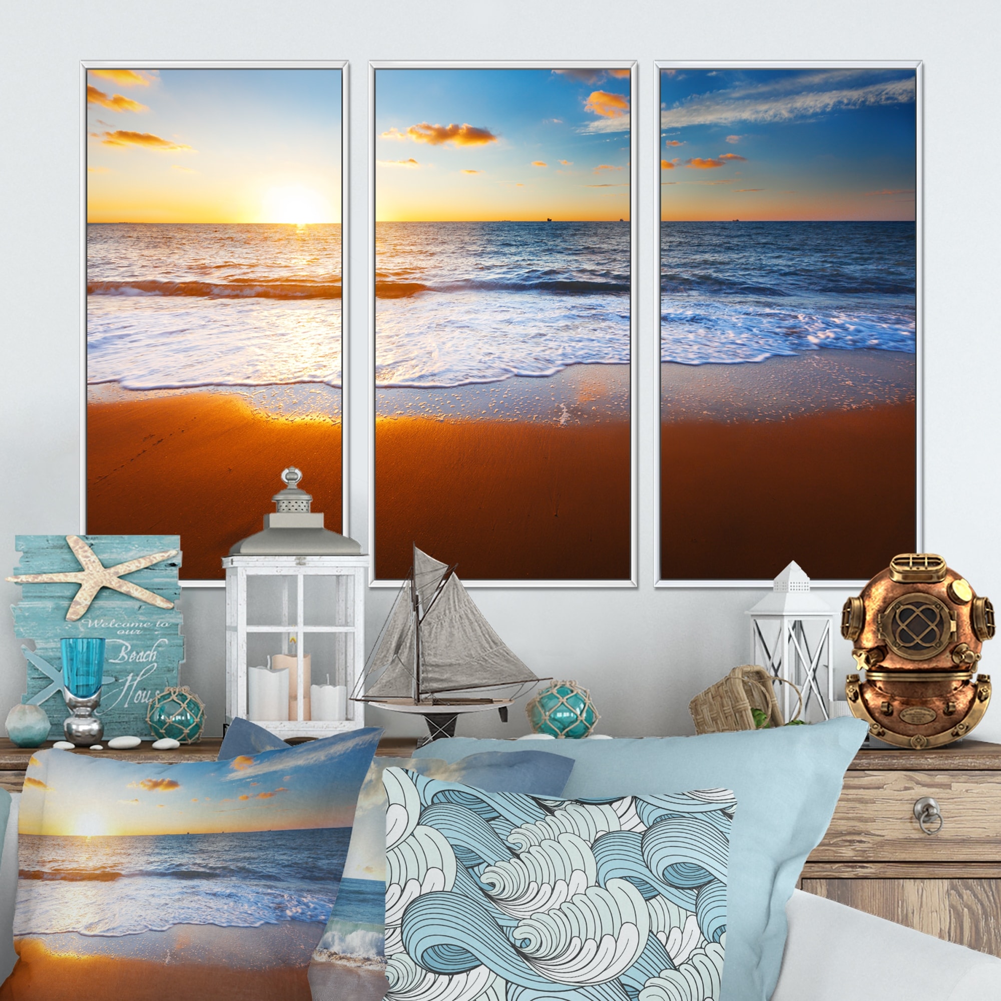 Designart "Sunset On Beautiful Sand Beach With Blue Sea Water" Nautical & Coastal Framed Canvas Wall Art Print - 3 Panels