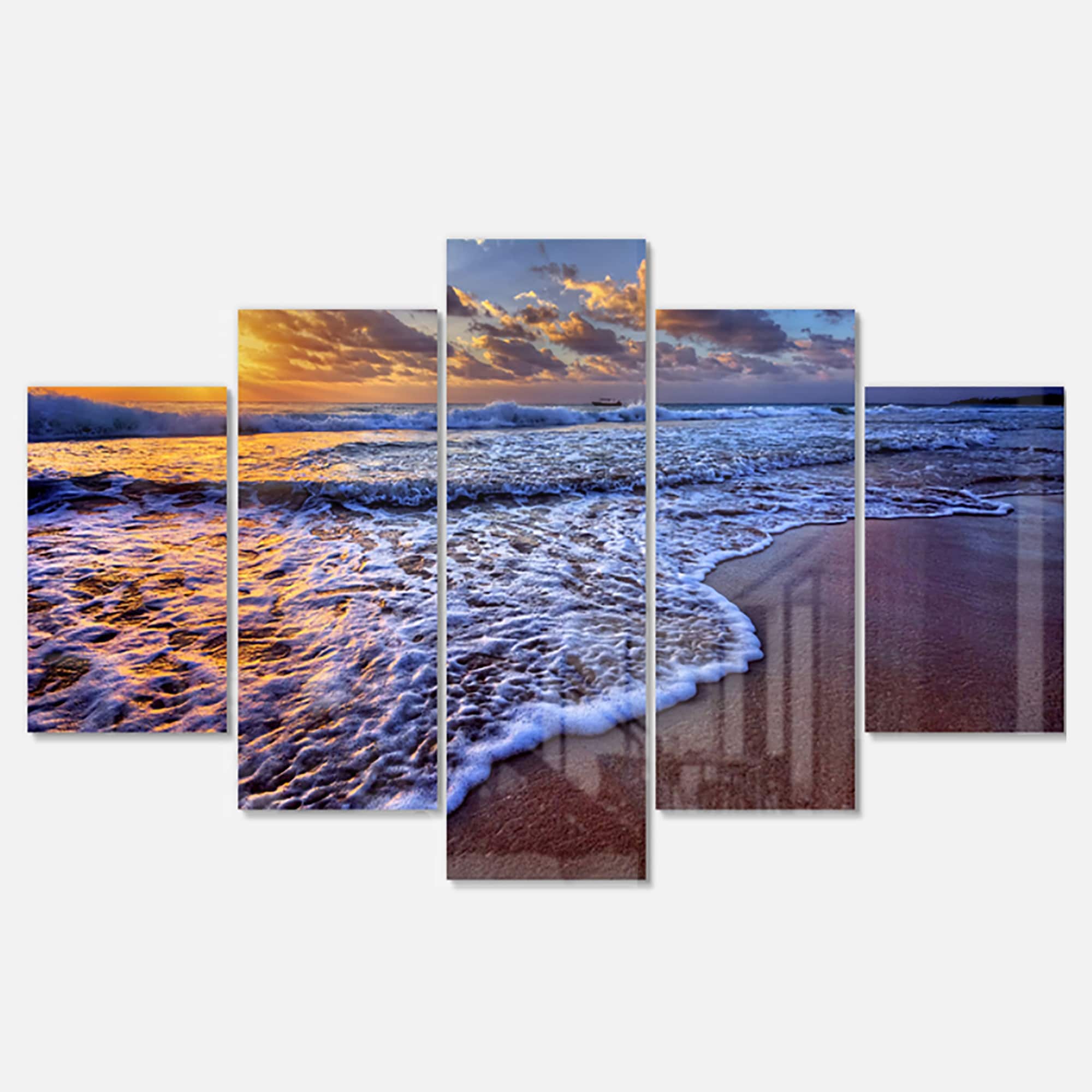 Designart 'Sunset over Blue Sea Waves' Seashore Metal Wall Art on