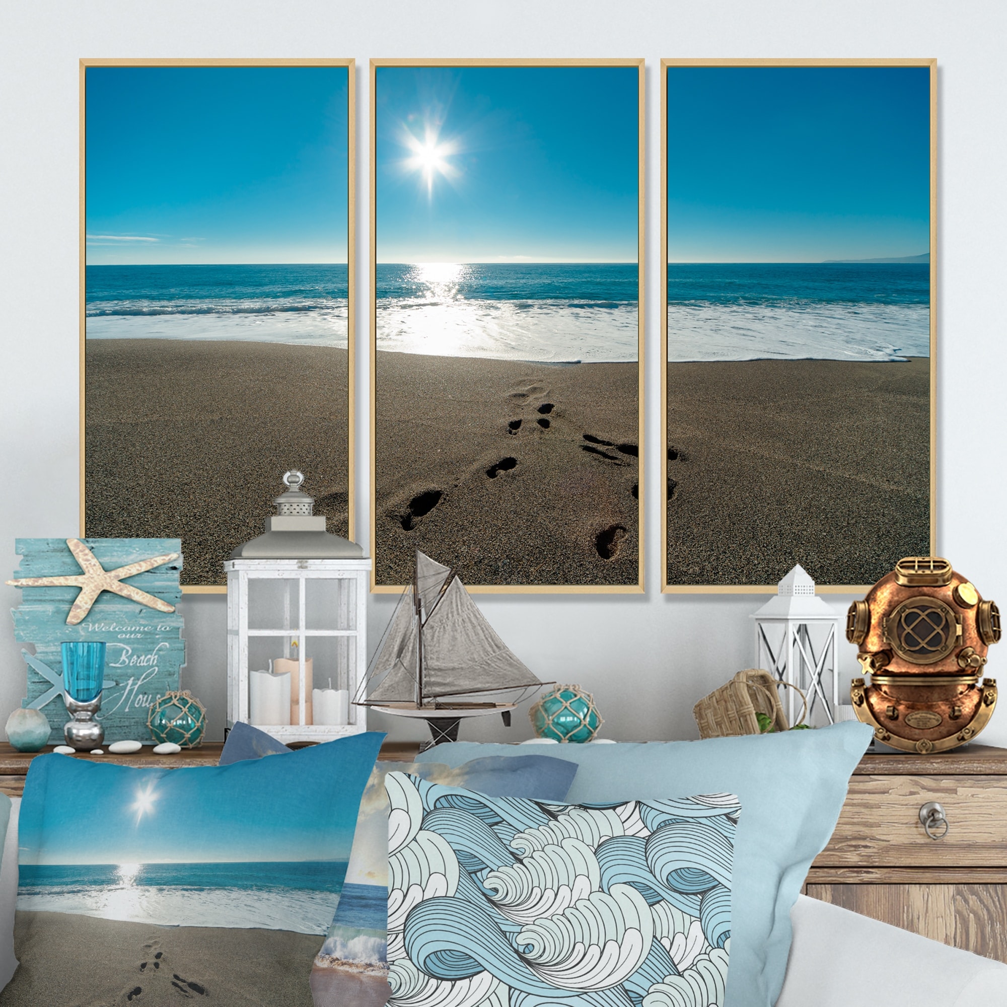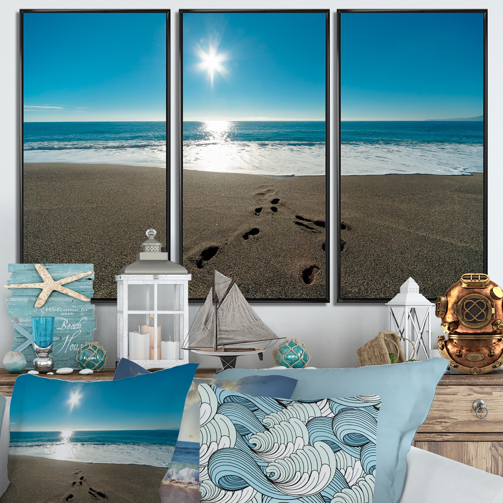 Designart "Blue Sea and Footprints in Sand" Sea & Shore Framed Art Prints Set of 3 - 4 Colors of Frames