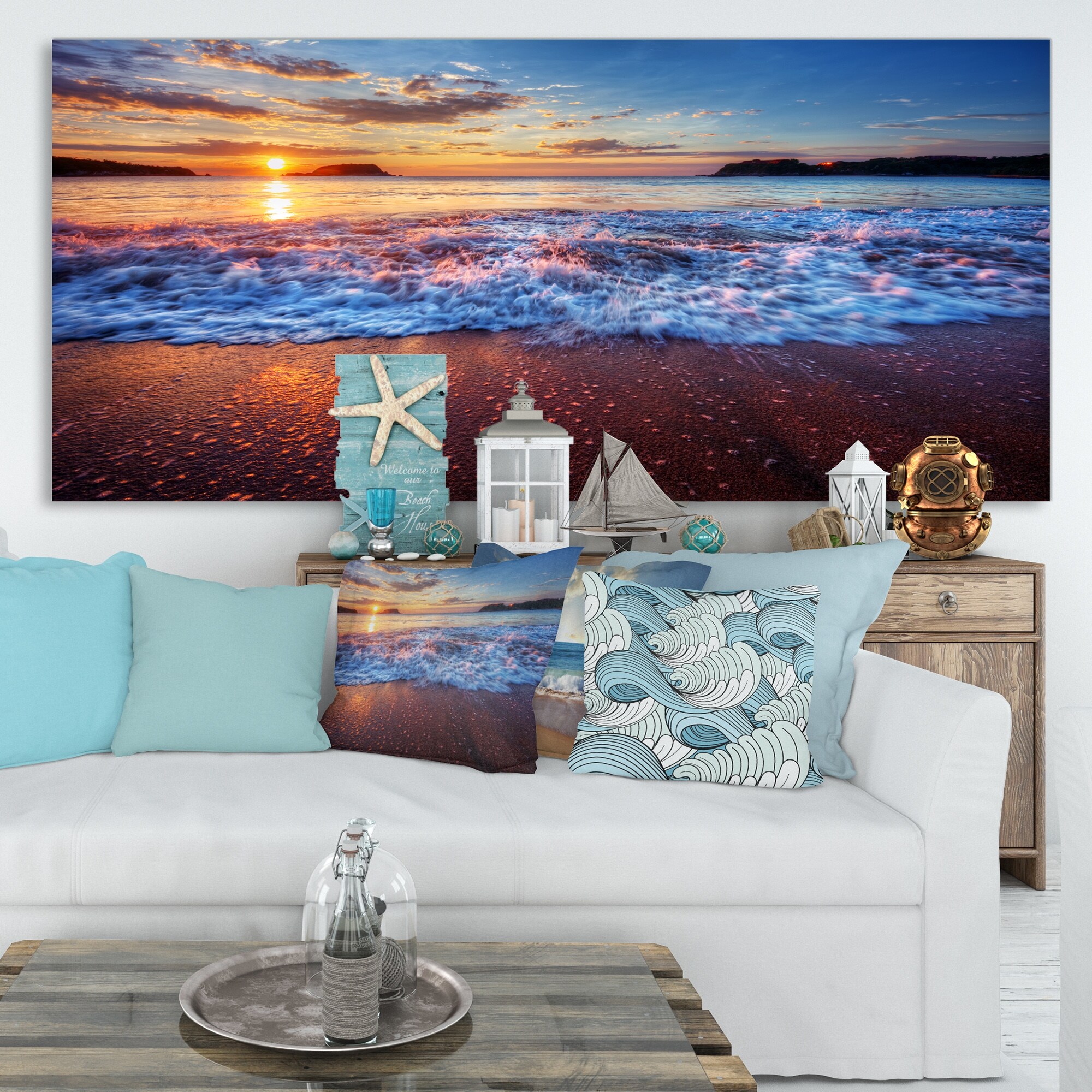 Designart "Blue Sea Sunset on Sandy Coastline" Seashore Framed Canvas Art Print