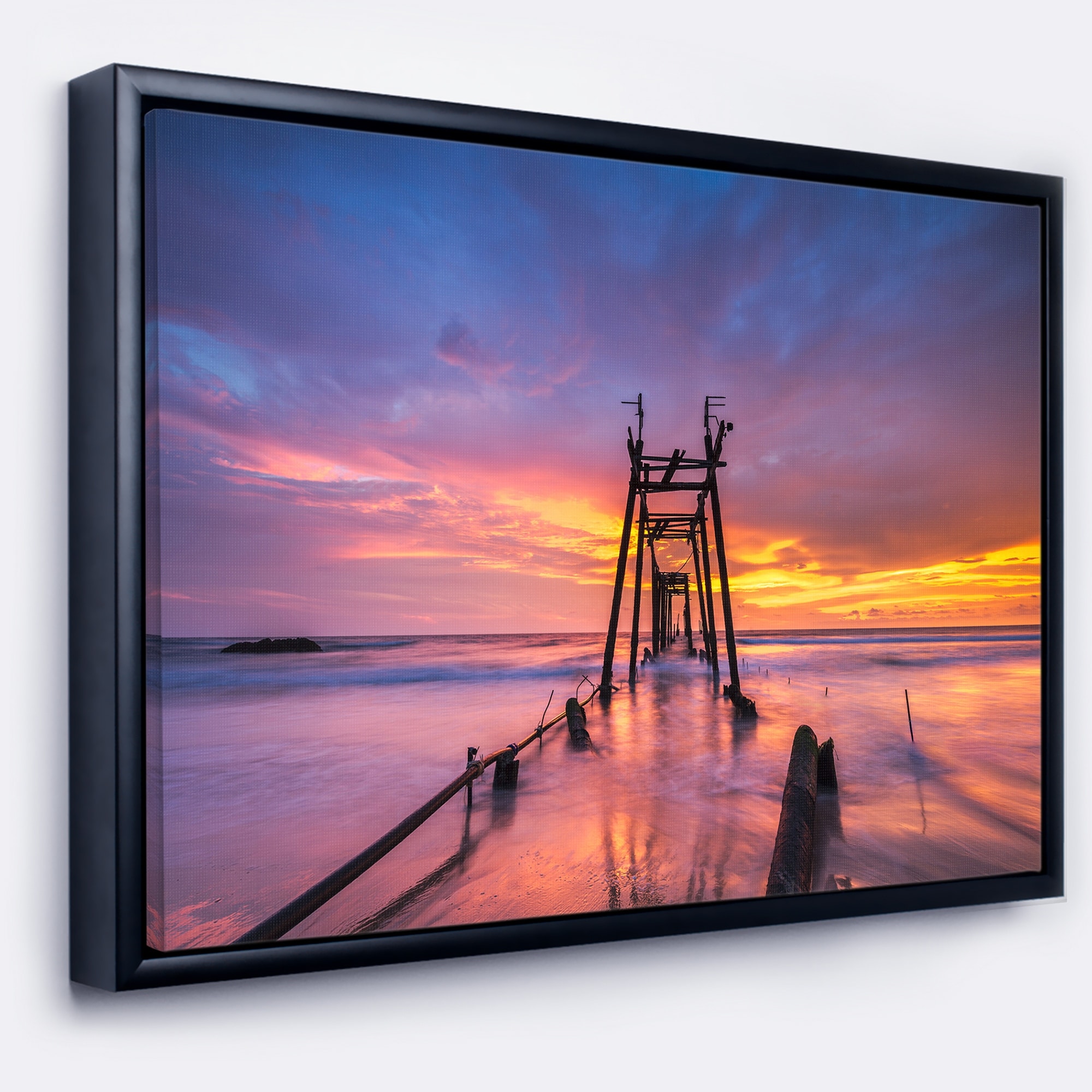 Designart "Broken Wooden Bridge at Sunset" Pier Seascape Framed Canvas Art Print