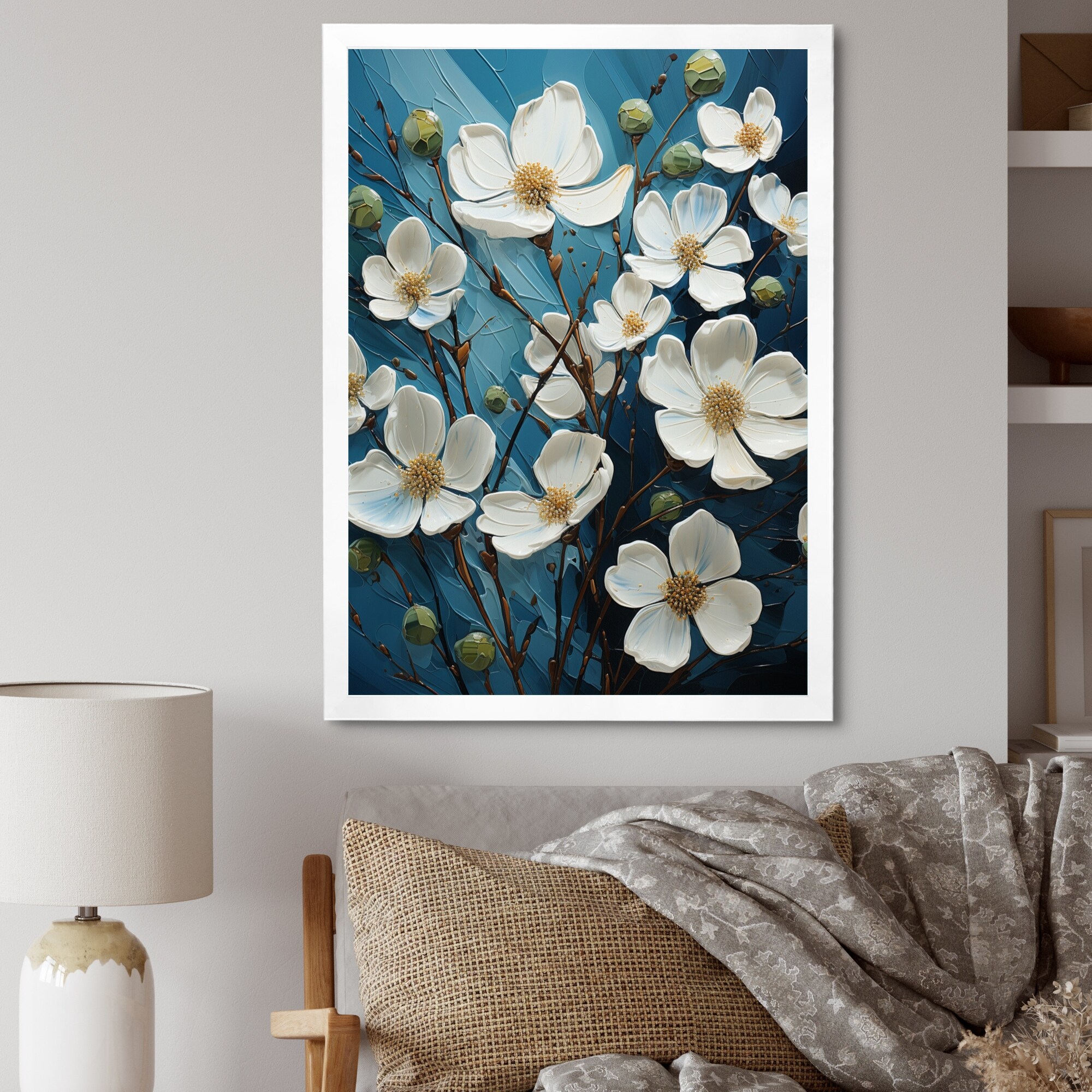 Designart "White Blue Dogwood Delight I" Dogwood Framed Wall Art Living Room