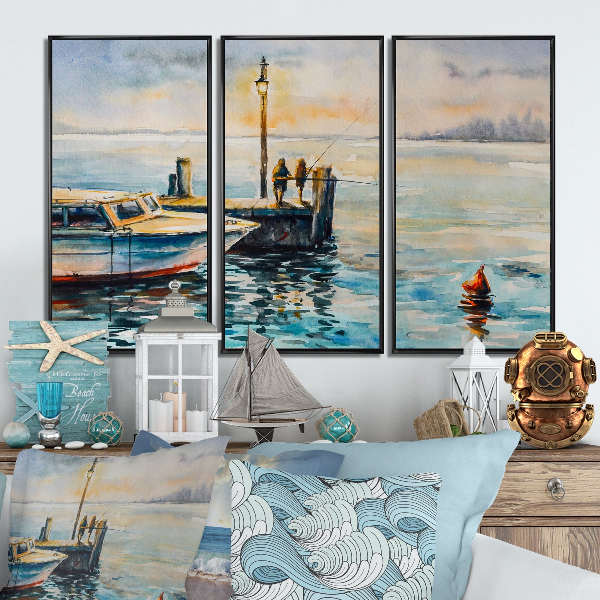 Designart "Two Men Fishing At Dusk At the Pier" Nautical & Coastal Framed Wall Art Set of 3 - 4 Colors of Frames