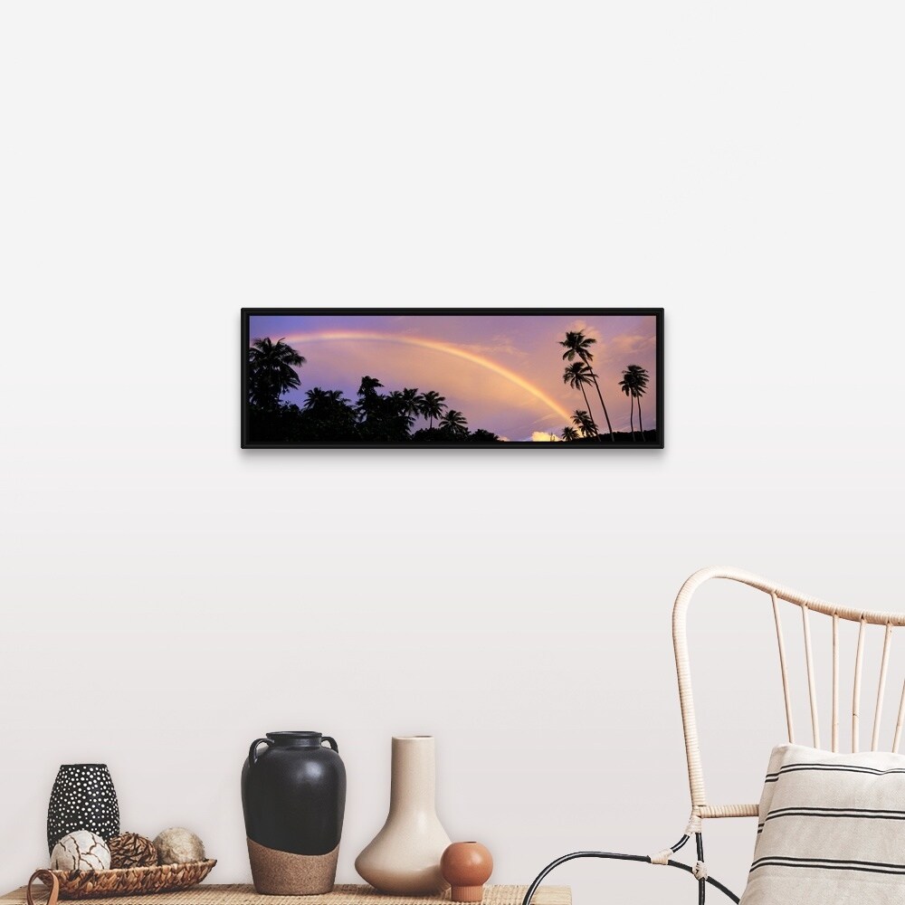 "Rainbow between palm trees at dusk, French Polynesia" Black Float Frame Canvas Art
