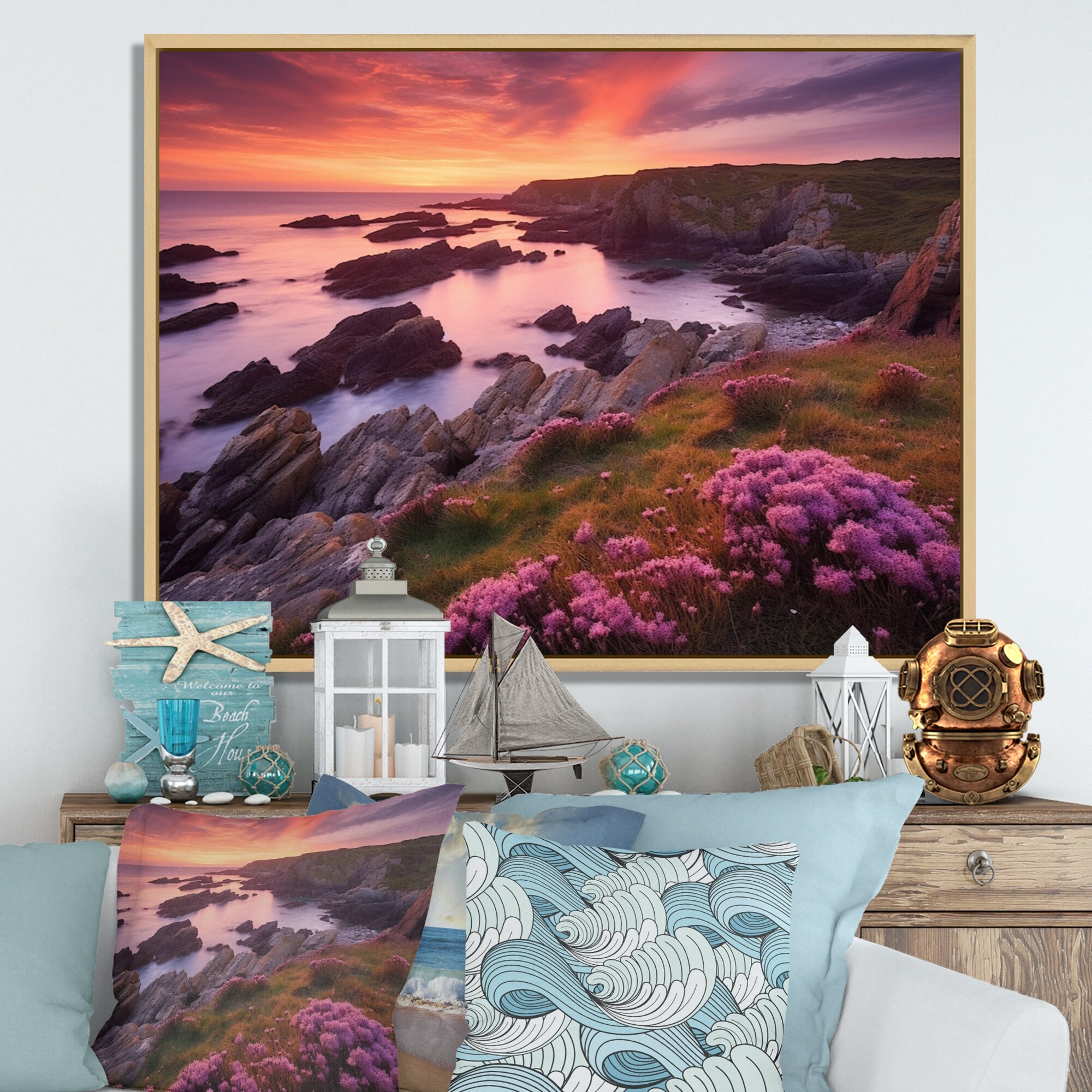 Designart "Beachside Cliff Dusk I" Coastal Framed Wall Art Prints