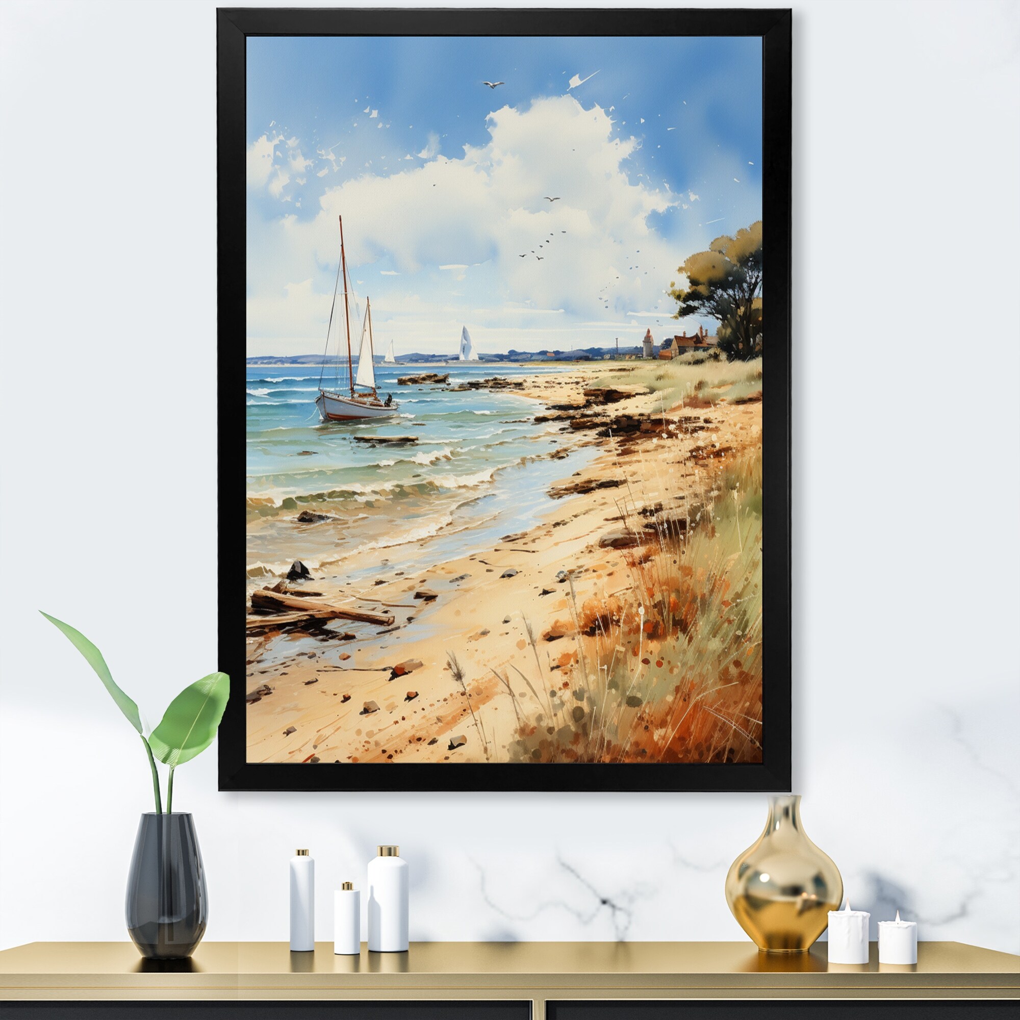 Designart "England Coastal Serenityengland Landscape IV" England Framed Wall Art Living Room