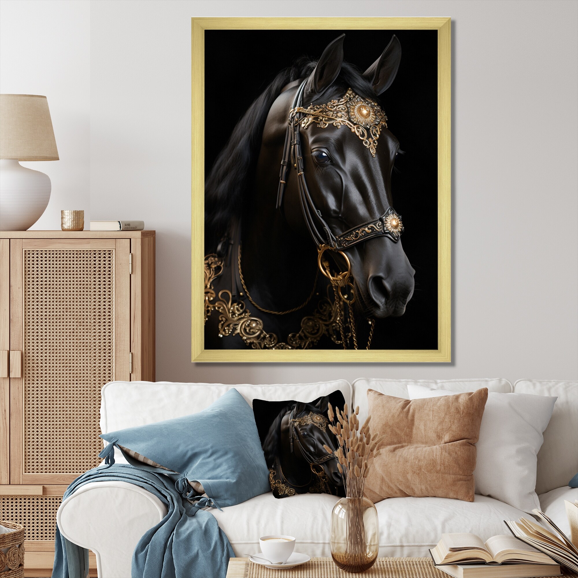 Designart "Black Gold Horse Golden Equestrian III" Animals Horse Framed Canvas Wall Art