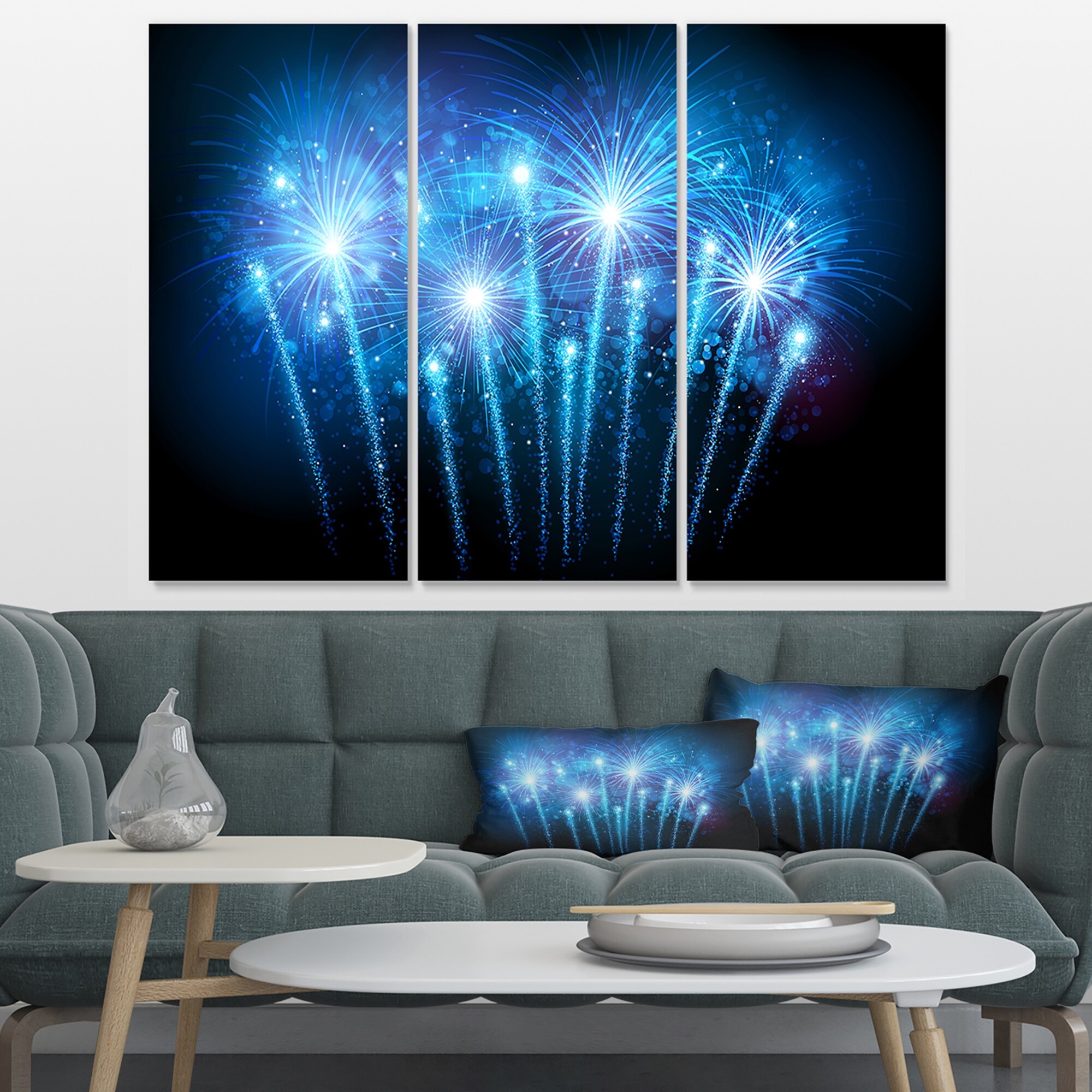 Designart "Blue Fireworks at Night Sky" Skyline Photography Canvas Art - 36x28 - 3 Panels