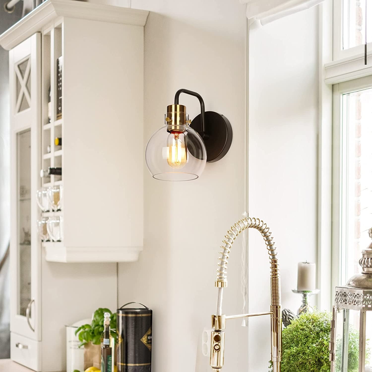 Modern 1-Light Black Gold Wall Sconces Bathroom Vanity Light with Globe Glass - 5.5" L x 8" W x 8.5" H